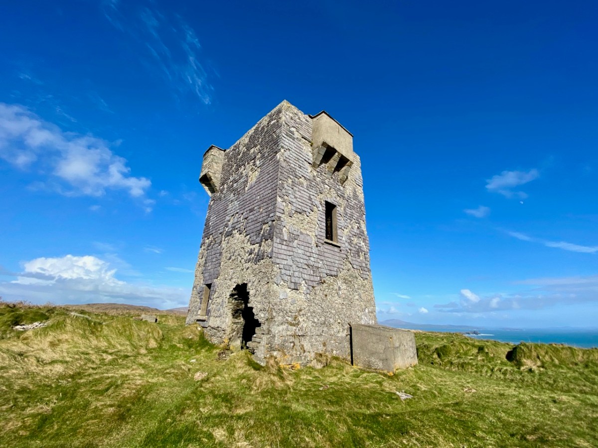 This photograph was taken in 1914. It shows the Marconi installation still in use: the signal tower is visible in the background, on the left. On the far right is a building which I take to be the electricity generating station, powering the telegraph. During the Emergency (1939 – 1945), a lookout emplacement was built to the south of the Marconi station: many of these were built around the coast, the majority sharing a site with a Napoleonic-era tower. Have a look here for more information on these comparatively recent structures.