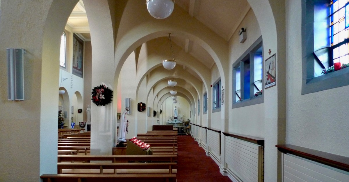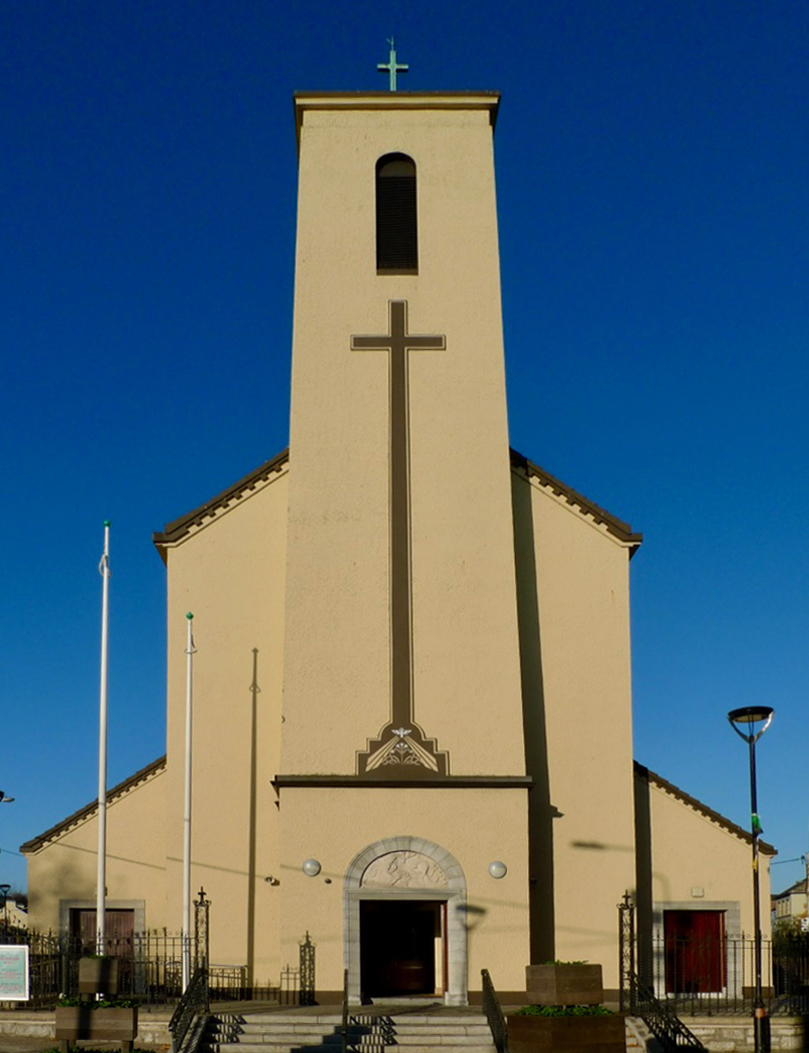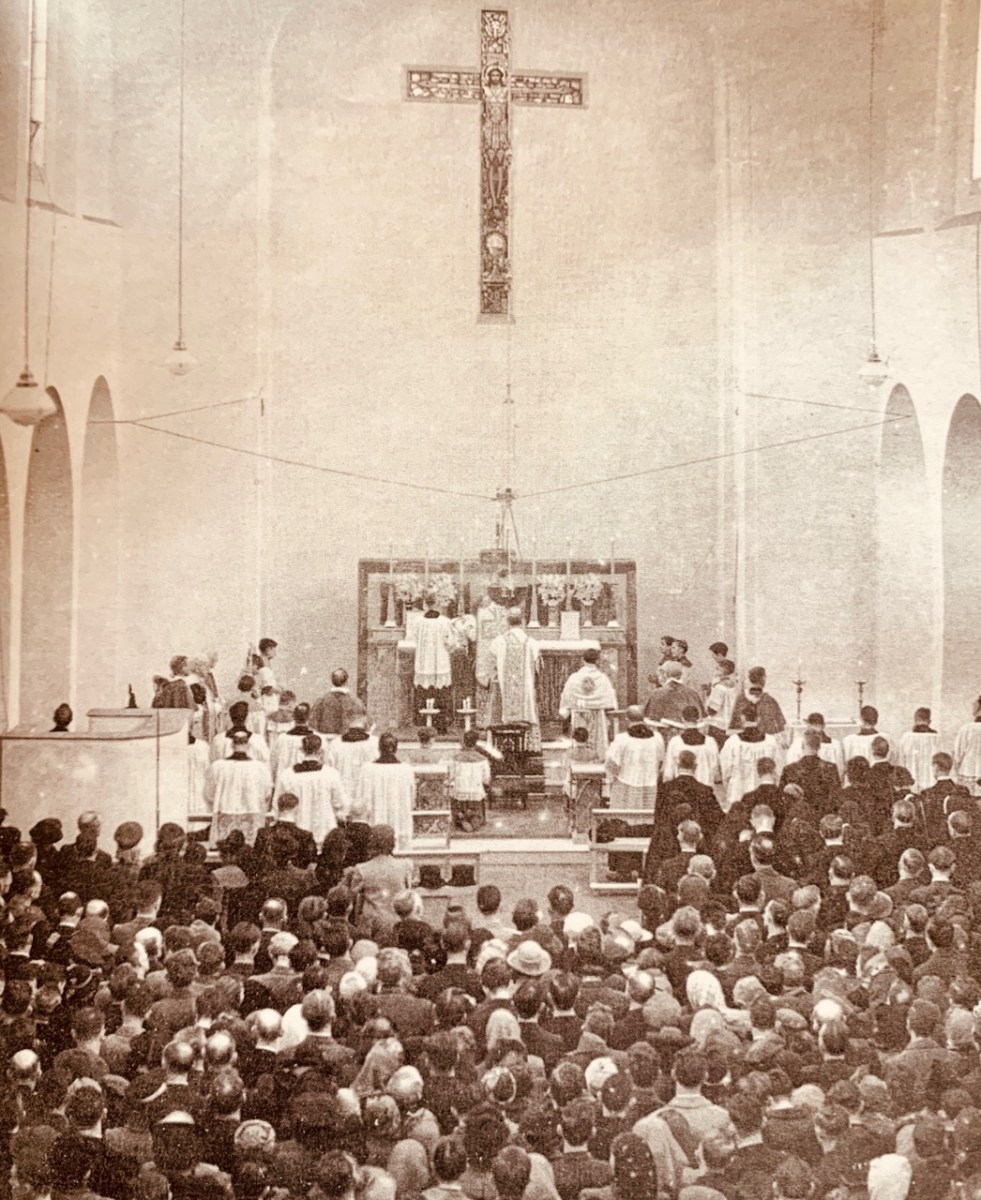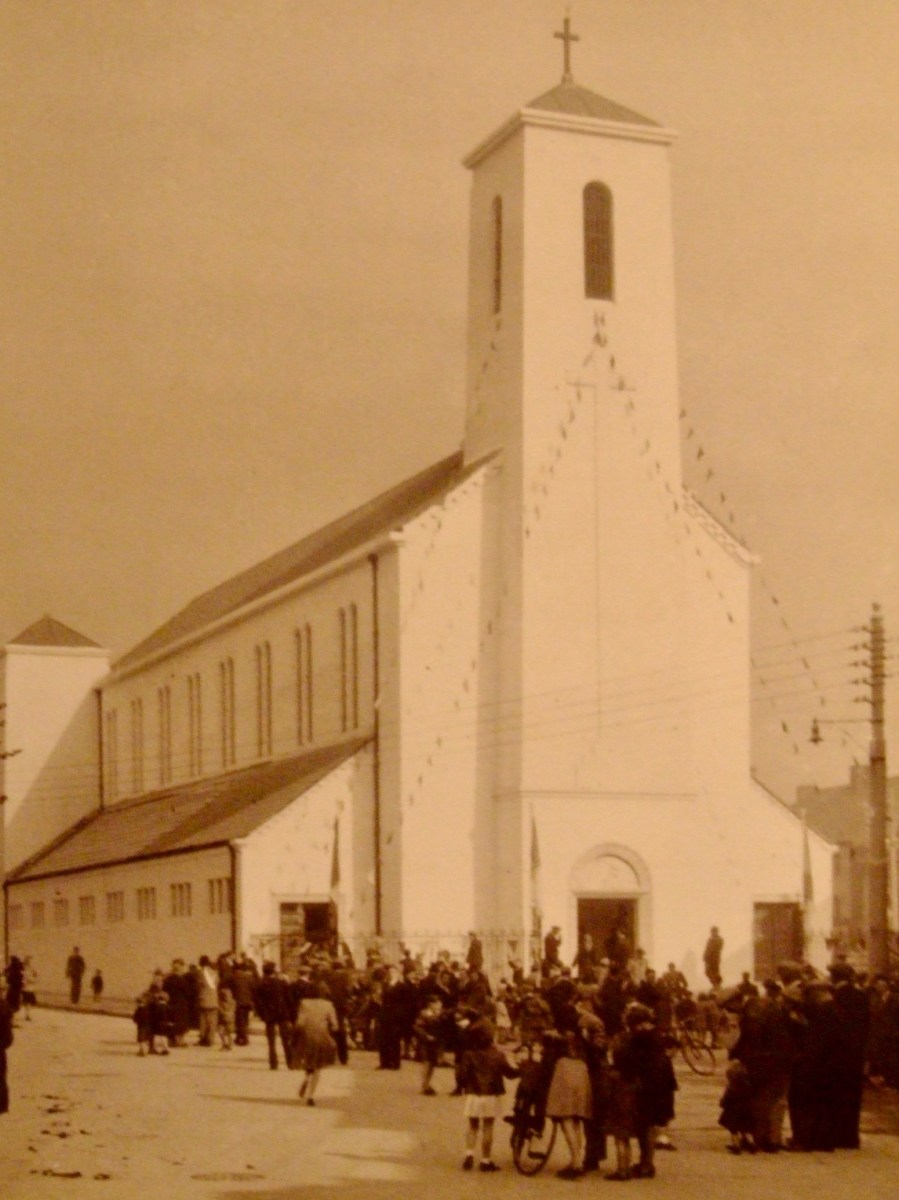 According to the Murphy family, Séamus found inspiration for Blackpool from pictures of churches in South America. In particular, the roughly textured render on the external walls is said to have derived from the adobe finish common in Spanish missionary churches there. The Cork church was commenced in January 1945, and the picture above (courtesy of Cork City Library) dates from around that time. The picture below – also courtesy Cork City Library – shows the dedication ceremony in the church on 7 October 1945.