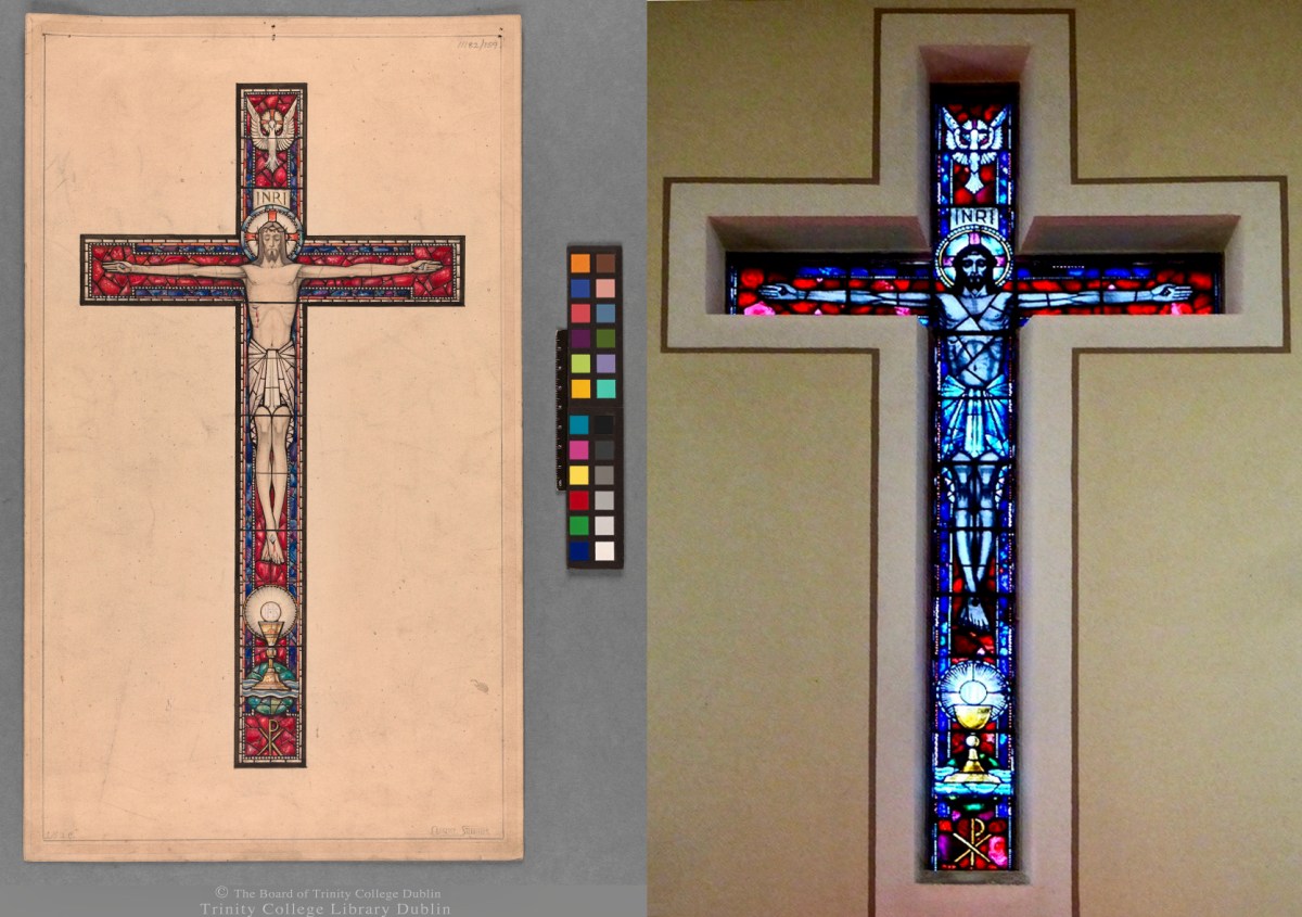Particularly striking is the crucifix window at the east end. Above is the original cartoon (courtesy of Trinity College Library Dublin) by Dowling, side-by-side with an image of the window today. All the windows are of fine quality.