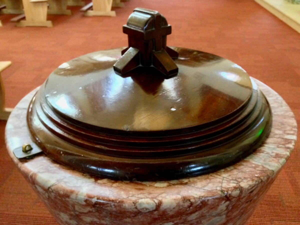 This fine font cover was carved by hand by Bart, a younger brother of Séamus.