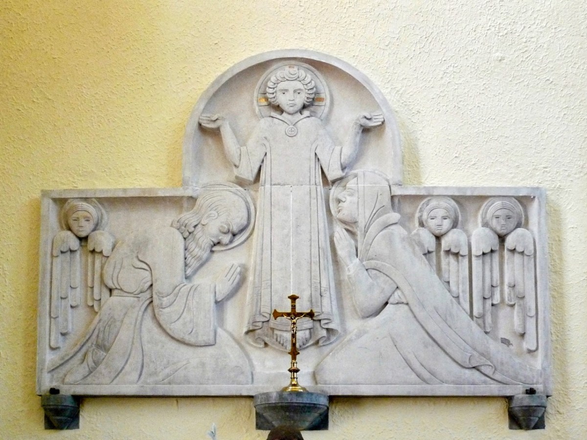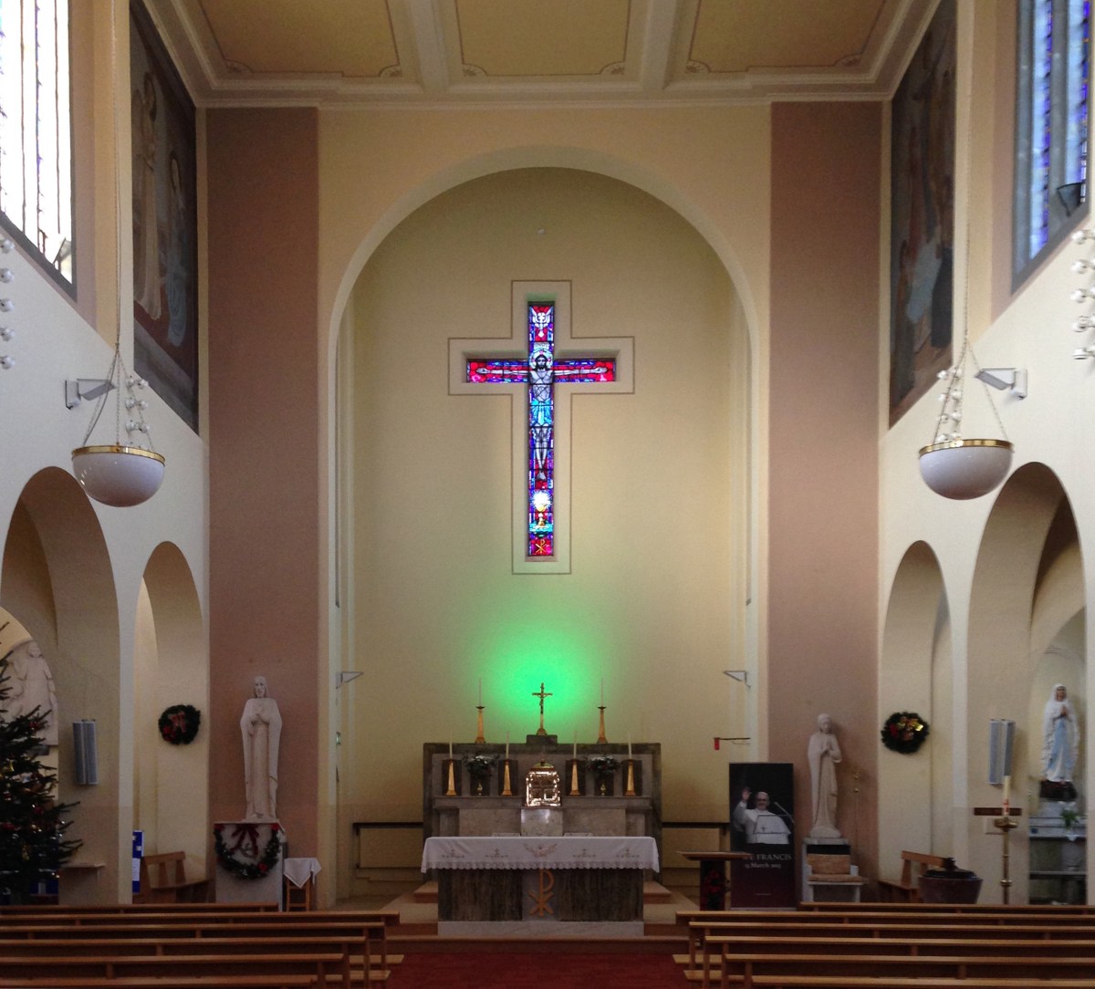 A full view of the east end of the church. The interior has changed very little over 77 years and is, therefore, a great tribute to Séamus Murphy and the the commissioning family of William Dwyer, then head of the nearby Sunbeam Wolsey factory. Dwyer funded the whole project as a memorial to his daughter Maeve who had sadly passed away in 1943.