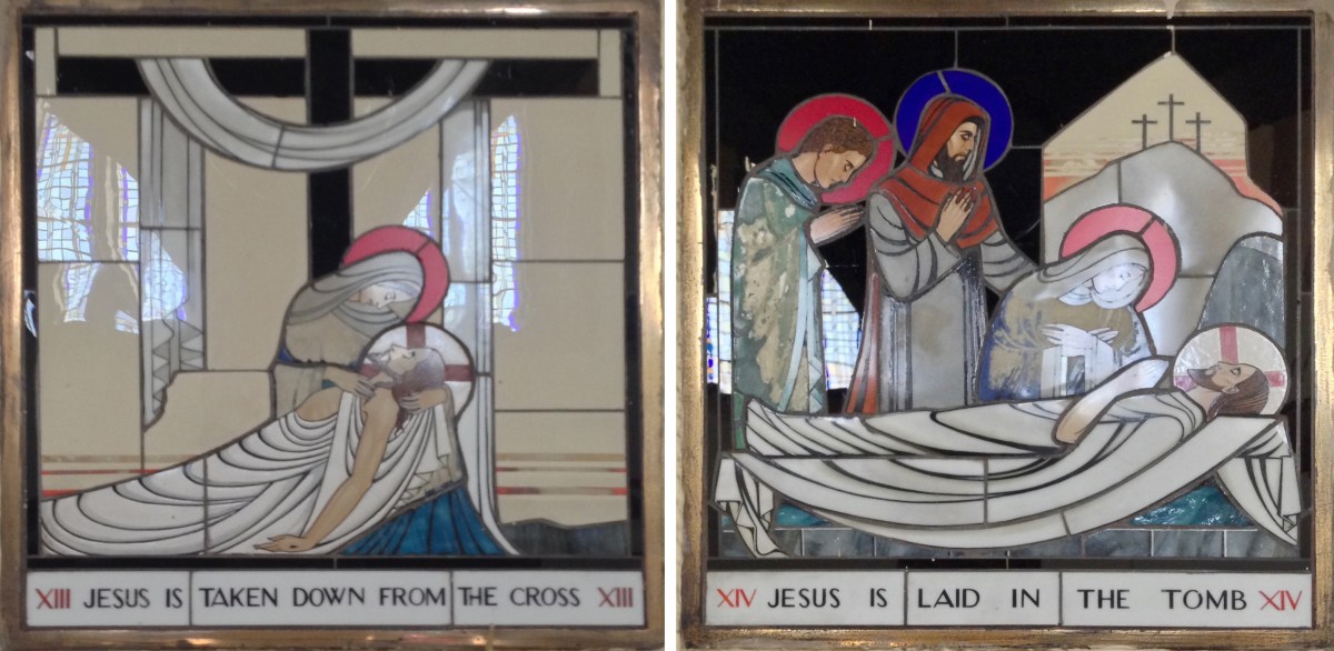 Examples of the ‘opus sectile’ Stations of the Cross are shown above. According to the Blackpool Parish website these were the work of Richard King. Finola has written extensively about this artist, who managed the Clarke studios after Harry’s death. She is also now researching the art-form of ‘Stations of the Cross’. In fact, researchers believe that these stations at Blackpool were carried out by William Dowling at the Harry Clarke Studios. Richard King was no longer working for the Studios in 1945, although he had produced designs of a similar style for Belvedere College SJ, Dublin, in 1939.