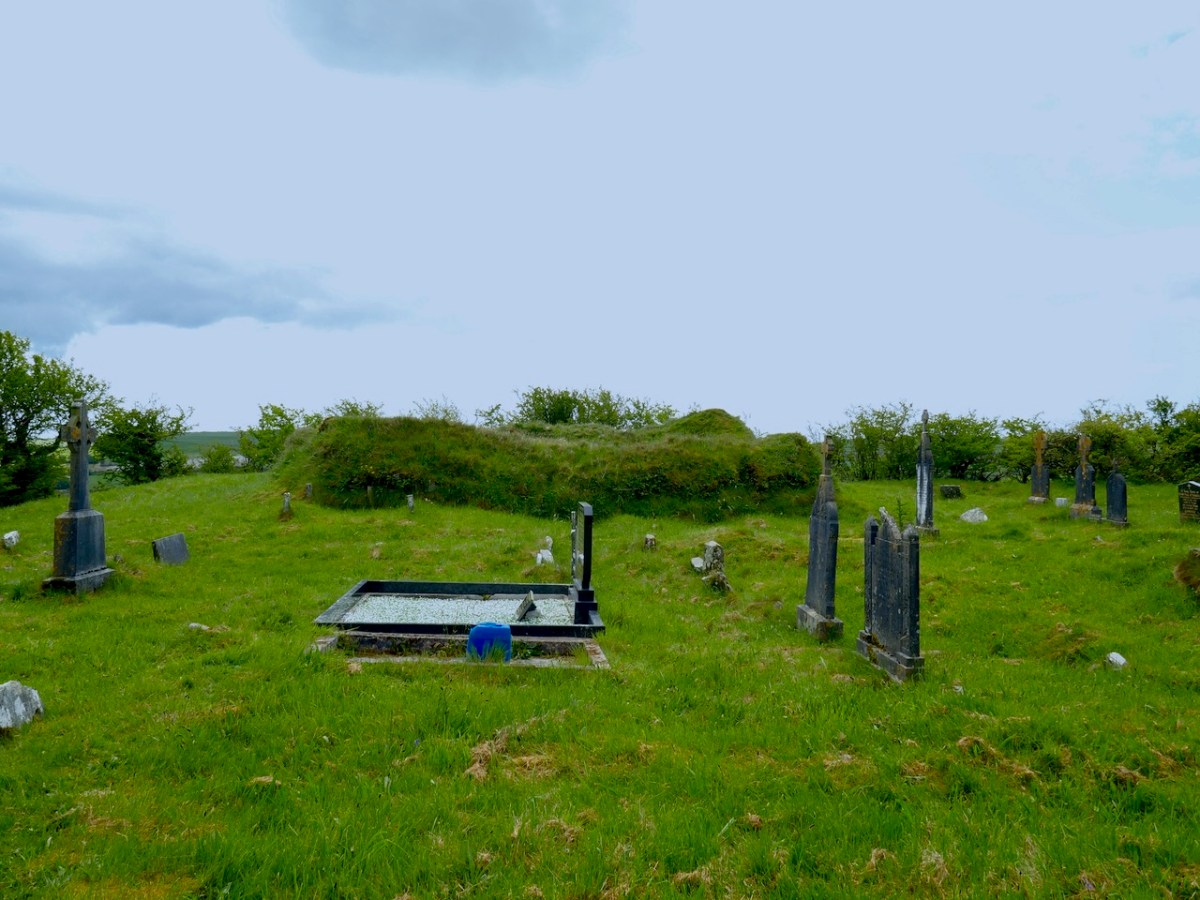 In pasture, atop knoll on E-facing slope. Circular, slightly raised area (32.6m N-S; 34.5m E-W) enclosed by two earthen banks, stone faced in parts, with intervening fosse. Break in inner bank to W, now blocked up; modern steps to E. Outer bank broken to W (Wth 3.5m), blocked up; S gap leads to laneway; modern break to NNW. Church (CO134-025004-), graveyard (CO134-025003-) and souterrain (CO134-025002-) in interior; second souterrain (CO134-089—) beside outer bank to E.
