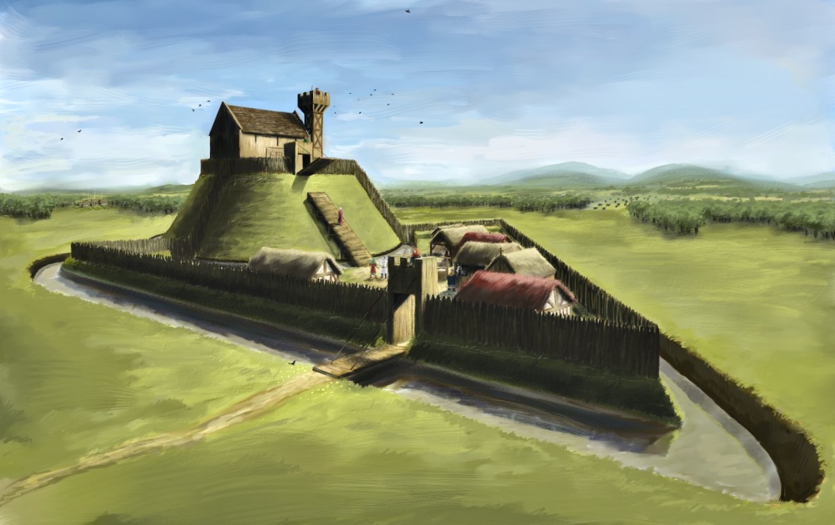 There is quite a bit of documentary evidence of their presence, though, including references to their ‘castles’ so it has always been a surprise that west Cork is not littered with mottes or ruined towers. Even given the tradition that they were all destroyed after the Battle of Callan, it is impossible to imagine that a motte could be obliterated from the landscape. They were substantial earthworks, as can be seen from the brilliant JG O’Donoghue‘s reconstruction drawing below.