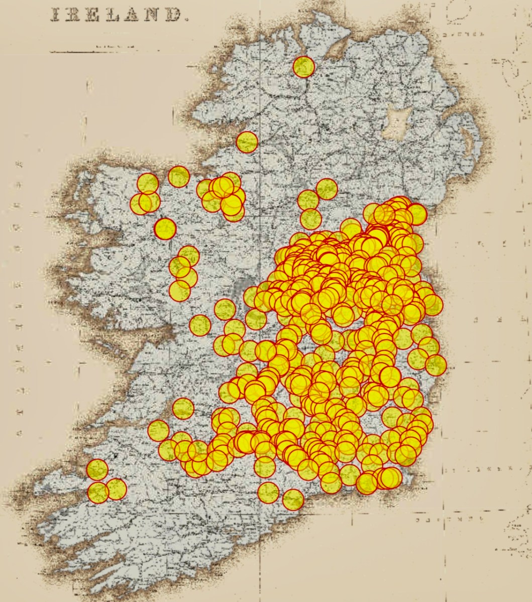 So is that why there is no trace to be found of the Anglo-Norman establishments in West Cork? In the rest of the country, at this early stage, they were mostly building motte and baileys, but there isn’t a single motte and bailey anywhere near West Cork – see the distribution map below, courtesy of National Monuments. And the masonry castles (or tower houses) we have were all built by the great Irish families. For a while I thought maybe Baltimore Castle was an Anglo-Norman building, but Eamonn Cotter has brought me up to speed on the excavation results and shown me it was much later.