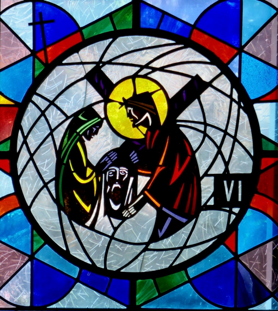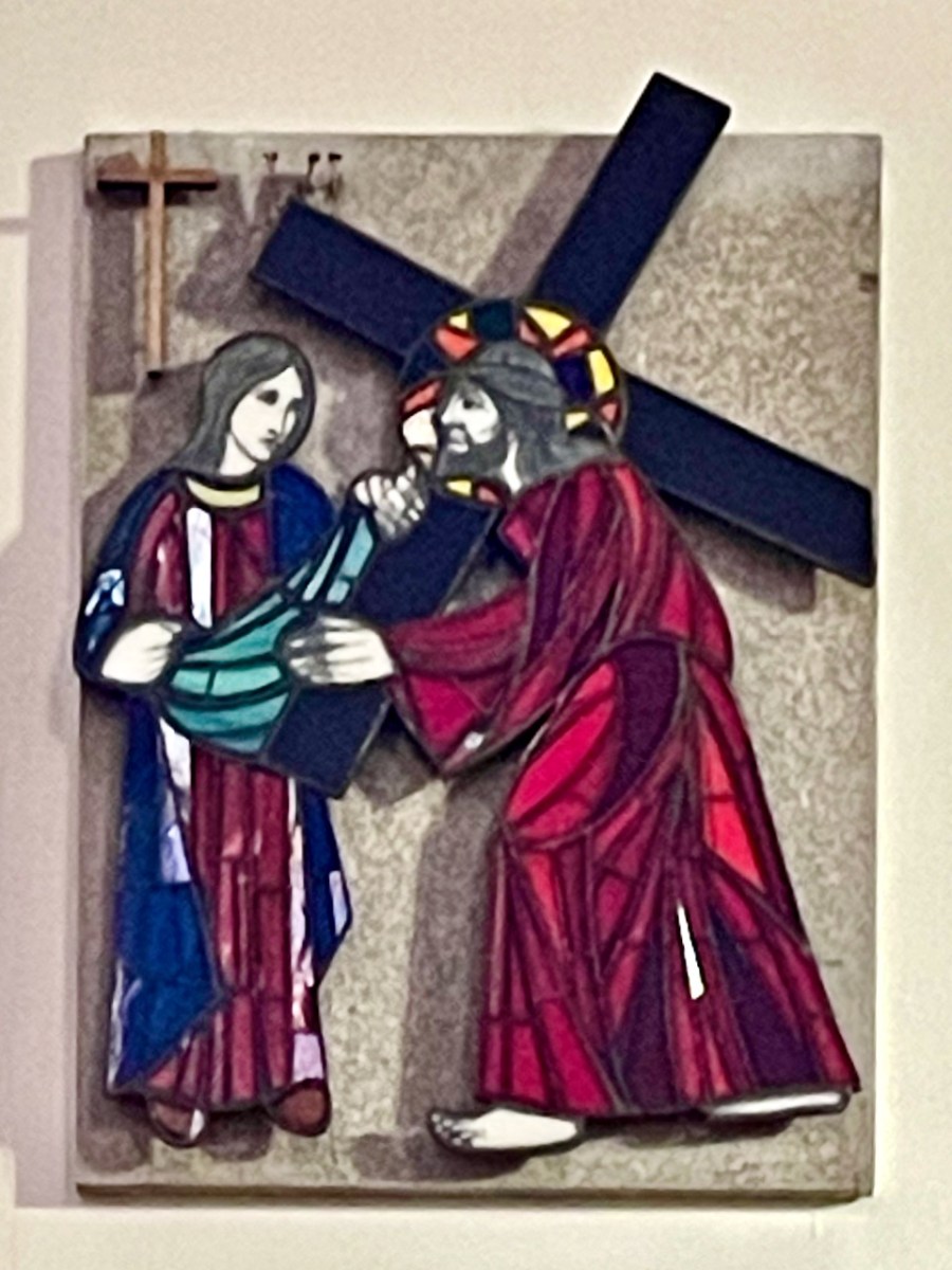 This is one of a set of stations made from antique glass and polished granite, done by George Walsh and Willy Earley for the Clarendon St church