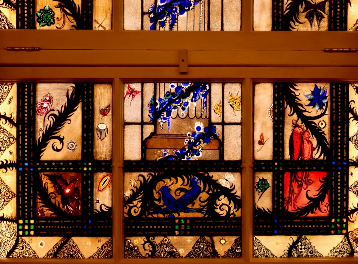 Although it comprises eight sides or ‘windows’ (each composed of five panels), Helen Moloney created just two different designs for the windows; from these she made four different colour versions and these were duplicated to create the eight different windows. Despite the fact that there are essentially just two designs and she chose a deliberately restricted colour palette, this repetition is hardly apparent and instead one experiences an almost overwhelming sense of intensely zinging complimentary colours enlivened by punchy graphic symbols. Moloney used only the best of mouth blown glass in a selection of rich colours including red, blue, yellow, purple, violet, orange, green, and aquamarine, and although she has included different shades of these, mostly they are full strength from maximum visual impact.