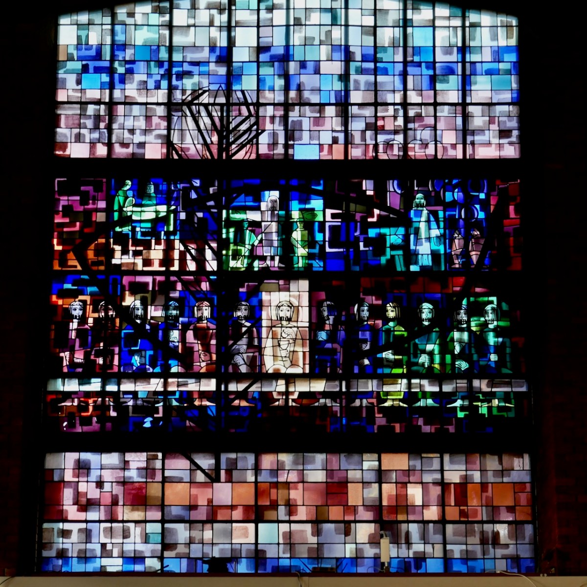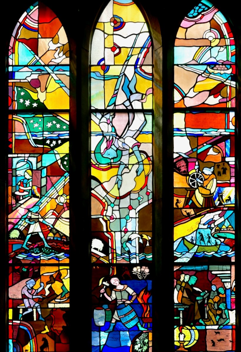 The book is laid out in sections: City, Dublin North and Dublin South (suburbs and county), encompassing thirty-nine locations. They are not all churches – Bewley’s on Grafton Street is included for its Harry Clarke windows (above, and above that), as well as the National Gallery with its excellent stained glass room, the Hugh Lane Gallery, home of Clarke’s Eve of St Agnes, and St Patrick’s Campus of Dublin City University, with its floor to ceiling expanse of dalle de verre by Gabriel Loire. This is a good example of a non-Irish artist included in the book. Gabriel Loire was French, and the internationally acknowledged master of the dalle de verre technique, in which slabs of glass, chipped round the edges to increase refraction, was embedded in concrete or resin, allowing for soaring walls of colour to be incorporated into the architectural scheme.