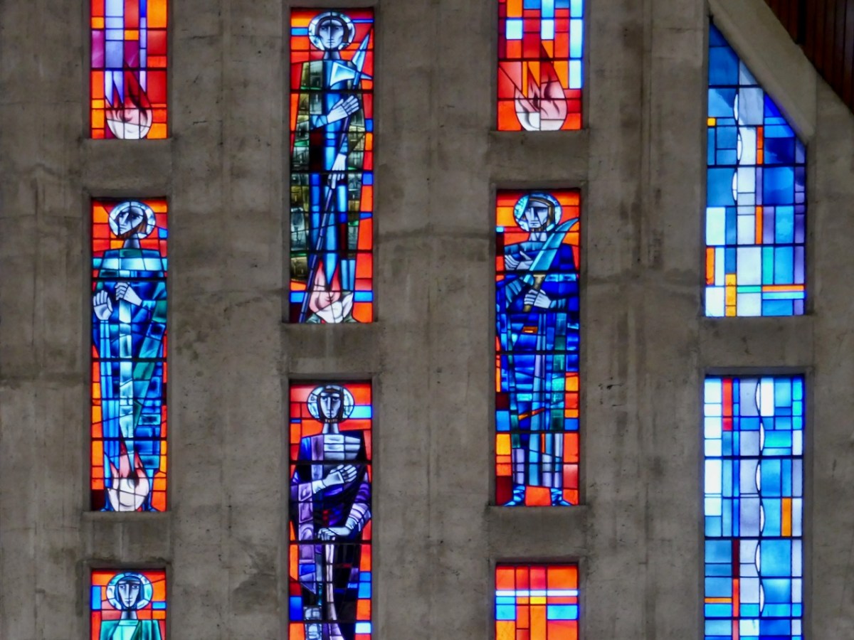 King was aided and abetted by the Murphy Devitt Studios. Johnny Murphy worked with King to provide all the surrounding glass, in harmonious shades and using the same mouth-blown glass. He also designed the dalle de verre windows at ground level, while Peter Dowd, Roisín Dowd Murphy’s brother, was responsible for the wonderful bronze doors. The day we were there a choir was practising for an upcoming concert. The sensory effect stays with me still.