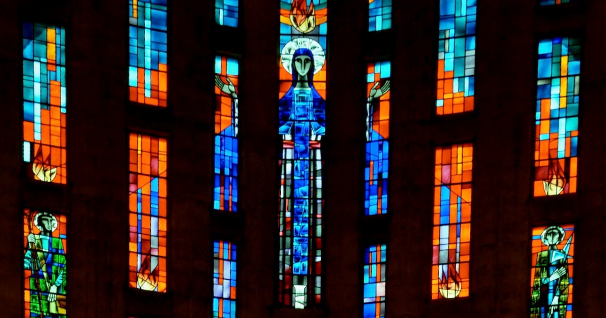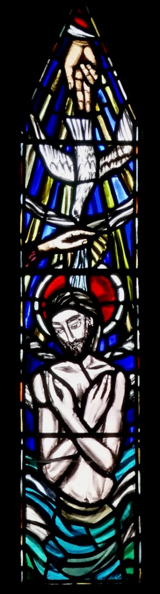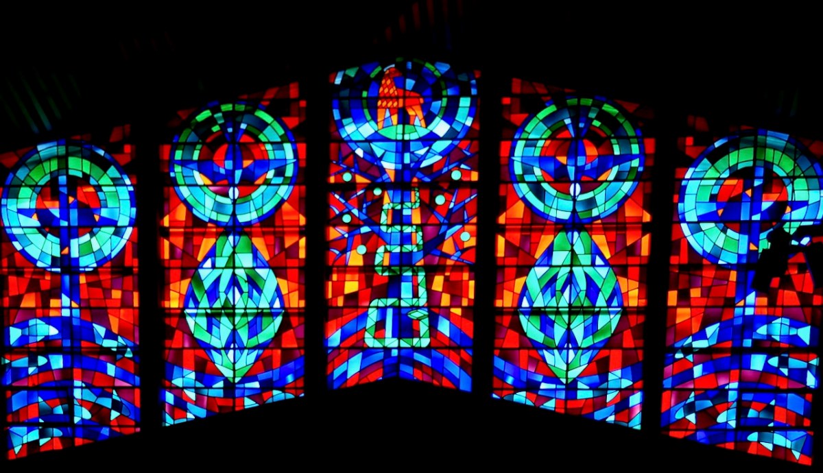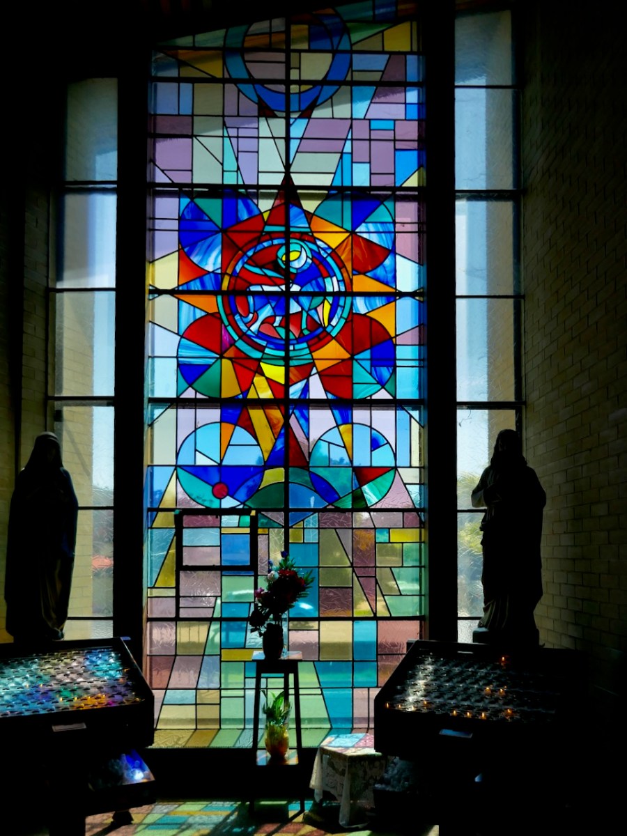 Secondly, you are immediately aware of being bathed in light and colour. There is a ‘lantern’ surrounding the central altar and this is the work of Helen Moloney. Here is David’s description: