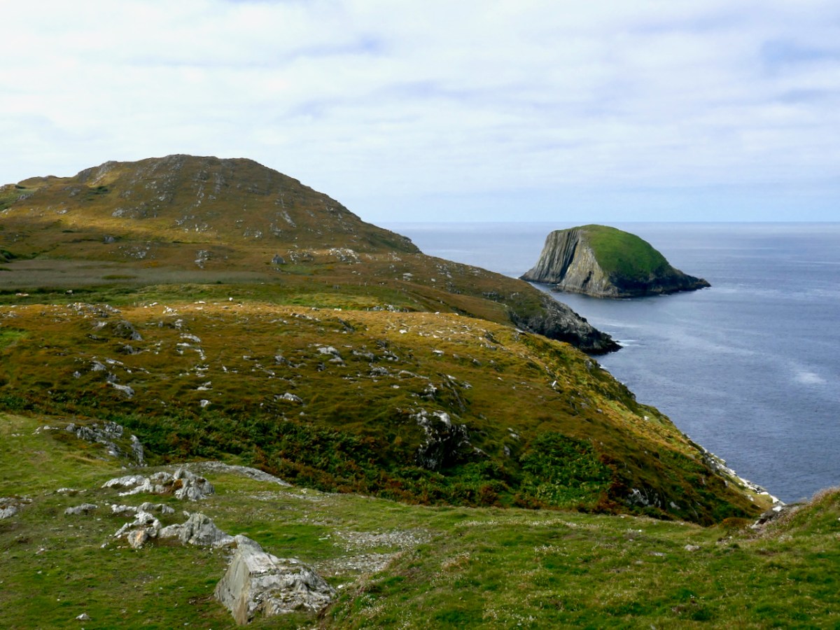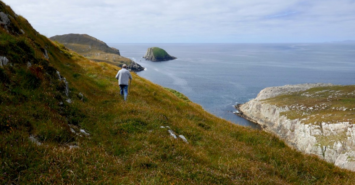 Finally, we have Lackavaun. Sea arches, a promontory fort, still-visible lazy beds, and a clear view to Bird Island. This was a tricky island to get on to, there was no landing place and it could only be attempted in calm weather. The first trip was to collect the eggs of the cóbach (the Black-backed Gull). Once ashore, the men attached ropes to iron bars which had been driven into the rock faces, and climbed down the cliffs to gather the eggs.