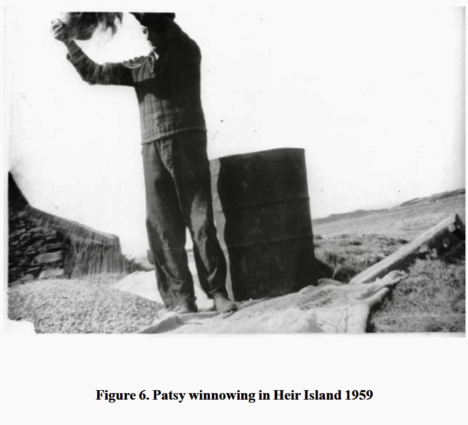 The cut wheat or oats outhouse to be beaten on stones which were on a long bench against the wall. It came out very clean. Then on a dry day it would be winnowed from a bucket onto a sail or something similar. [Joe]