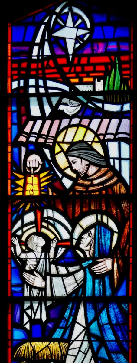 Details from a set of stained glass windows, all by George Stephen Walsh in the Nativity of Our Lady Church, Loughmore, Co Tipperary, dating to 1977. George Stephen apprenticed under Harry Clarke, presenting himself at Harry’s studio 100 years ago, in 1925. The family story is that when Harry saw his portfolio, he said Can you start at 10:30? George Stephen was 14.
