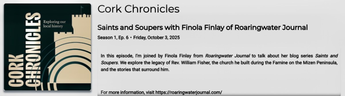 And – although it wasn’t my blog post, I really enjoyed being on the podcast Cork Chronicles with Shannon Forde. We drove out to Toormore and talked about Rev Fisher, the protagonist of my Saints and Soupers series, and the firestorm of accusations and counter-accusations about his actions during the Famine. You can listen to the podcast by clicking on the image below.