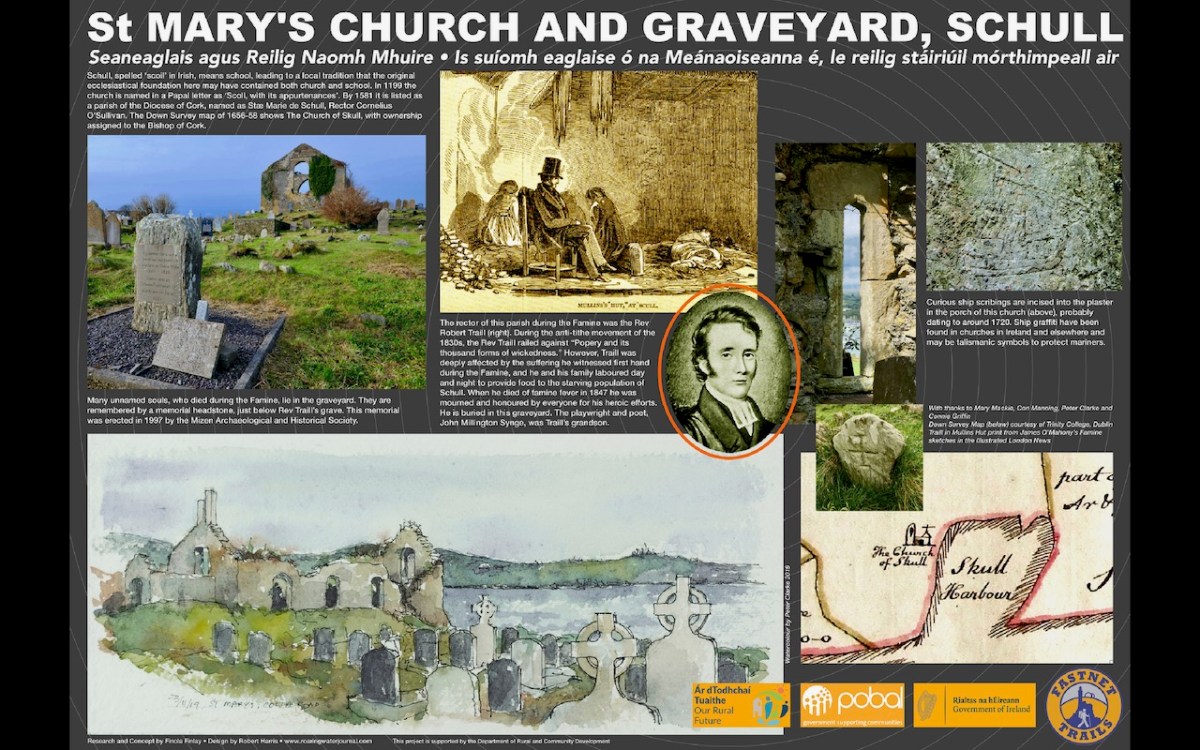 Before we leave St Mary’s I will mention it is the final resting place of many anonymous souls who died during the famine, as well as the Rev Robert Traill, about whom I wrote in my series Saints and Soupers. Traill’s story in Schull started out as that of a typical evangelical clergyman, despising the Catholics and railing against Popery and its thousand forms of wickedness, but ended heroically as he laboured night and day to feed the hungry all around him, dying himself of famine fever. Read more about Traill here and here.