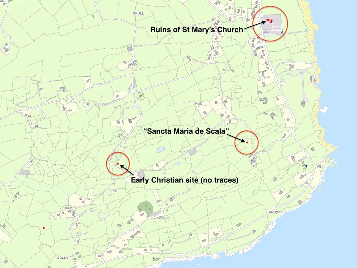 One of the topics Robert tackled was the name – Schull, or Skull as it is invariably given on old maps. In two posts he traced the possibility that somewhere around here was an ancient ecclesiastical settlement named for Mary. In the first one, he referred to the The National Monuments record which states: According to local information, this is the site of Scoil Mhuire or Sancta Maria de Scala, a medieval church and school that gave its name to this townland and to Skull village . . .