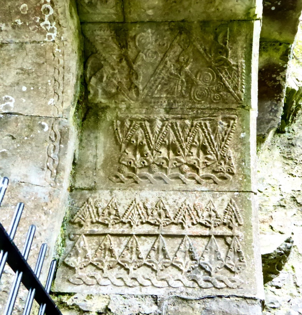 This room may also have been used as a private chapel. The clue is in the nature of the remaining carvings. The window on the South side has a crucifixion on the east end, but the whole surround is carved with stylised foliage and scroll patterns. While it is difficult to photograph this, the information board has a great illustrations (even if backwards from how it is viewed).