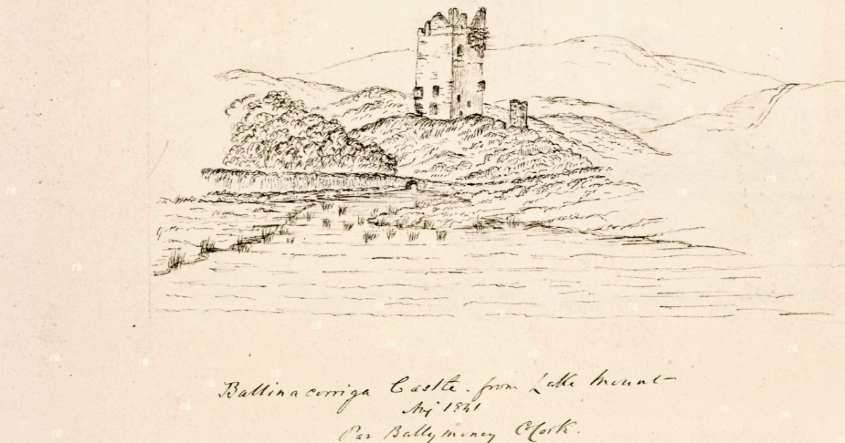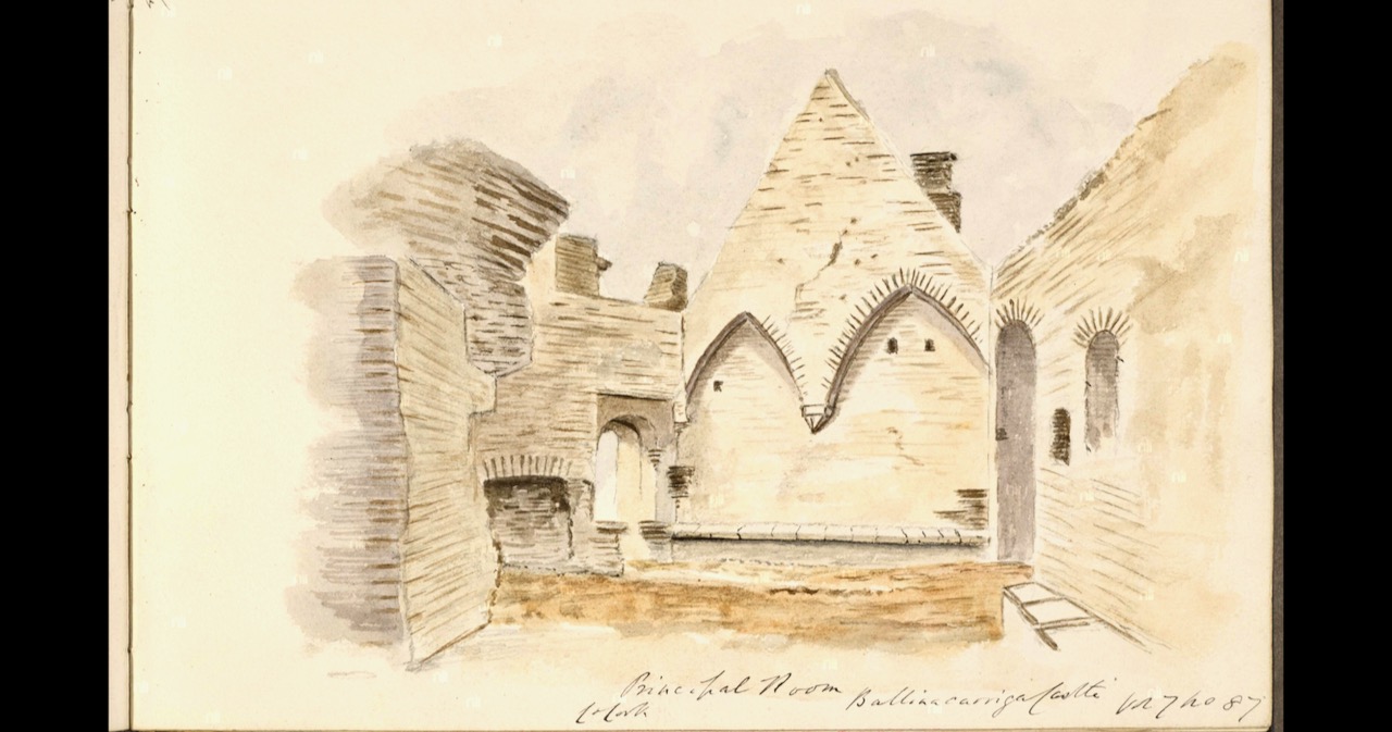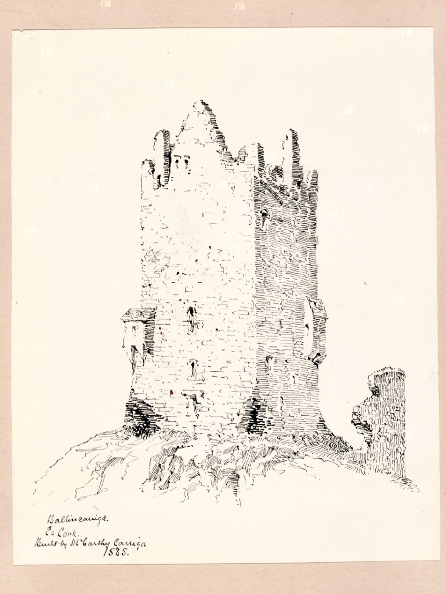 The romantic situation of Ballinacarriga Castle, and its relative intactness, meant that it was a favourite of antiquarians and travellers. There was a great appetite in the nineteenth century for images and accounts of all things to do with Irish antiquities – we were rediscovering our past and revelling in the realisation that we had a proud and significant heritage. Two of those illustrators, William Frazer and James Stark Fleming, visited and drew Ballinacarriga for their series on castles and other antiquities. Fleming, a Scottish solicitor and a constant visitor to Ireland was an accomplished watercolour artists and architectural historian. In all, he produced 10 volumes of drawings of Irish castles*. His sketches ( like the one below) were made on the spot.