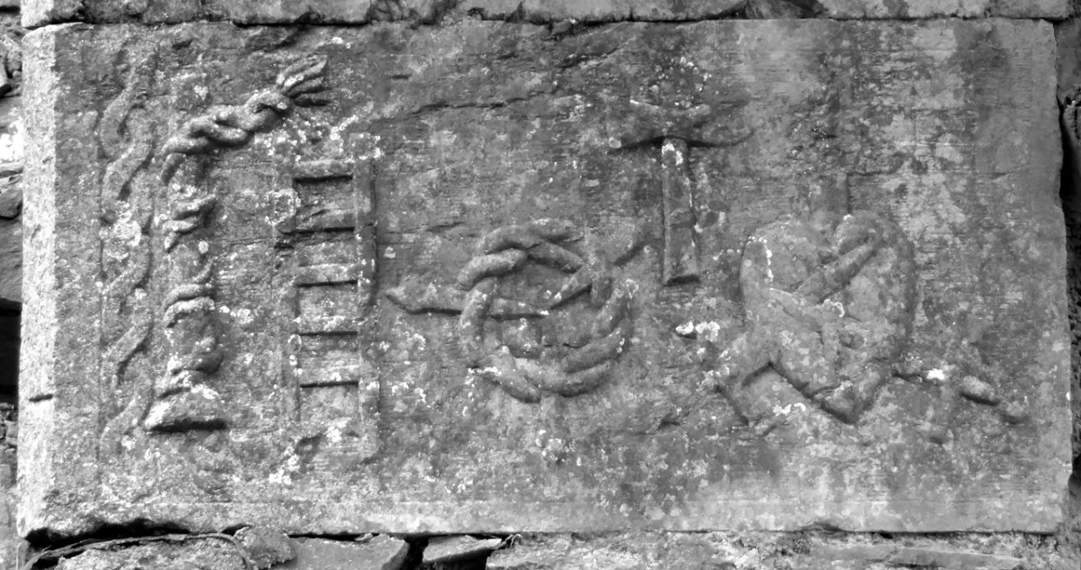 Equally intriguing is the Arma Christi, or Instrument of the Passion panel on the opposite (north) wall. This is a motif that is also familiar from much later 18th century headstones. It was a particular favourite of the Franciscans, and the Hurleys may well have had good relationships with the friaries in Bantry or Timoleague, and a Franciscan confessor (pure speculation on my part).