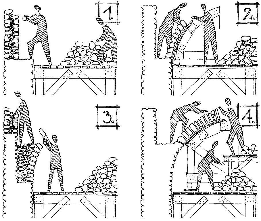 A scaffolding of wicker was erected first and a layer of mortar laid on top of that. Ceiling stones were laid on the scaffold and mortared into place and then the stone work was built up to provide the floor of the next story.
