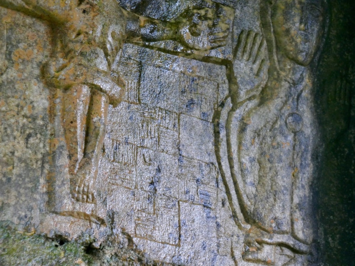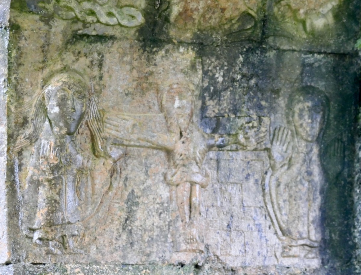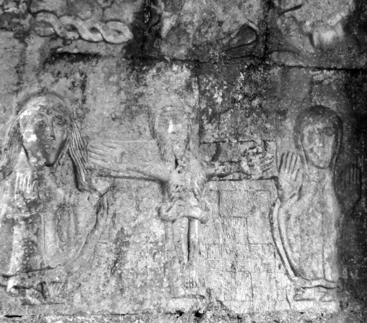 The crucifixion scene actually looks a little archaic – more like a Romanesque carving than a 16th century one. That may have been because local craftsmen were working in a persistent native tradition rather than following Continental Renaissance trends. Jesus on the cross is flanked by Mary and John. The carving is naive, the hands are disproportionately large and the feet are pointing sideways. There is a checkerboard pattern as background. I have provided a black and white image as well as the colour photo, in case that helps.