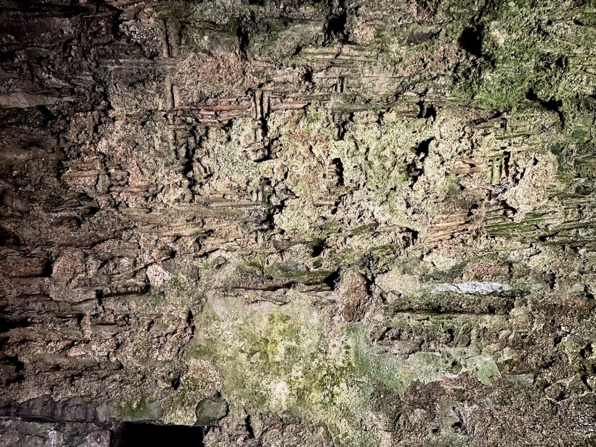When the scaffold was dismantled the impression of the wicker was left on the mortar – and in this case it looks like some of the wicker stayed behind as well.