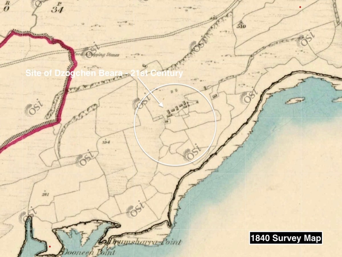 This shows one of the meditation rooms (courtesy of Dzogchen Beara Tibetan Buddhist Retreat Centre), with Pi Jun Taiwa in meditative posture. Below is a satellite image of the site showing its proximity to the coast and, below that, an extract from the 1840 OS map. I was intrigued to know what the buildings are that are shown occupying the site in those times. I have been unable to find the answer but wonder if they were connected to mining: the great copper-mining centre of Allihies is situated inland from here, but there are said to be ore-bearing lodes at Dooneen point, south-west of the new Centre.