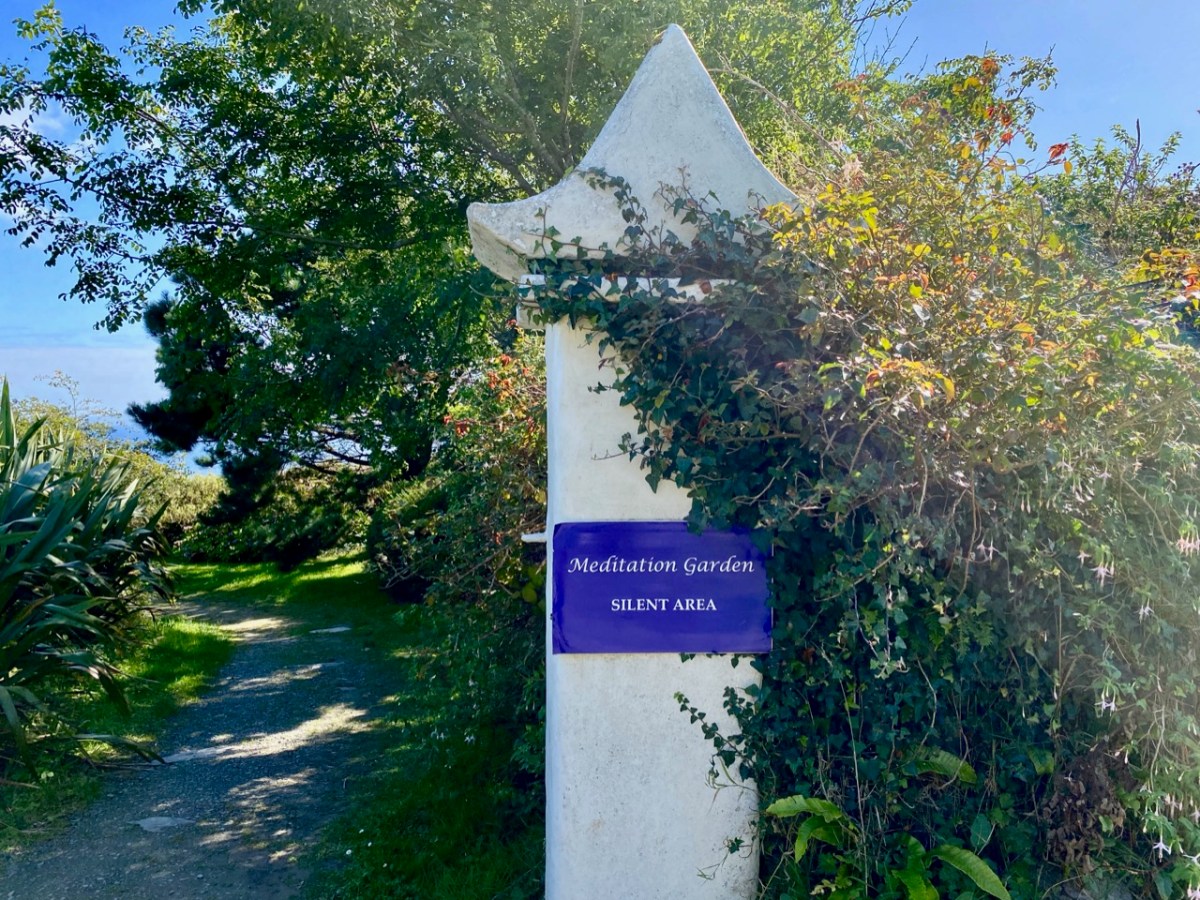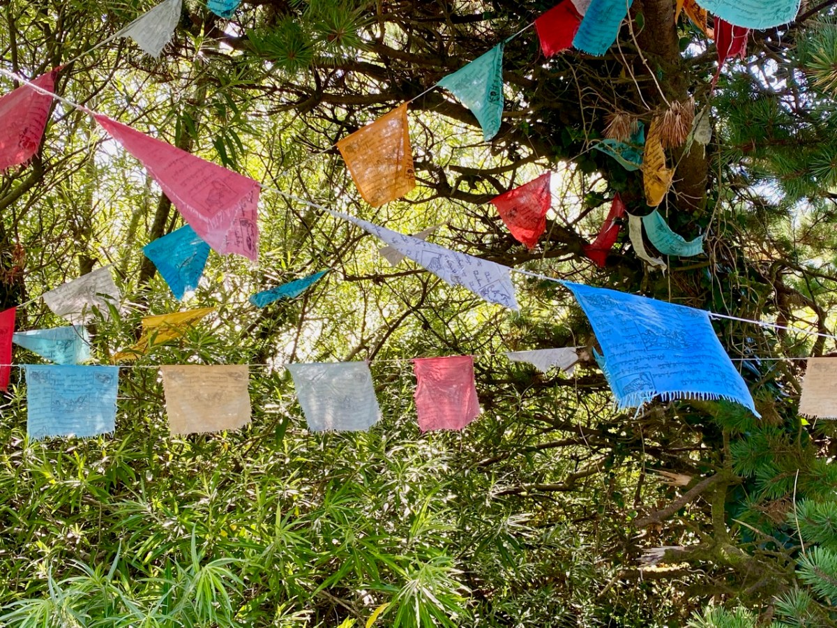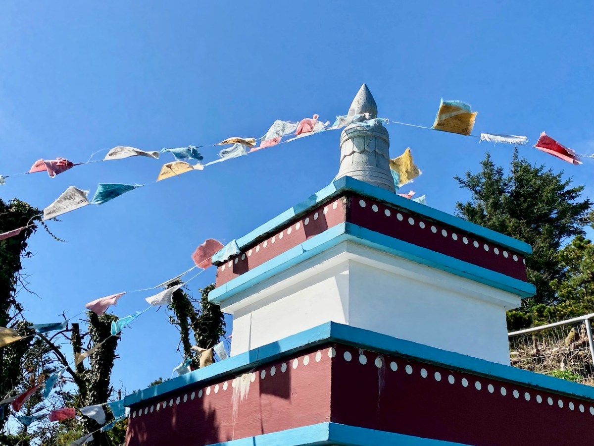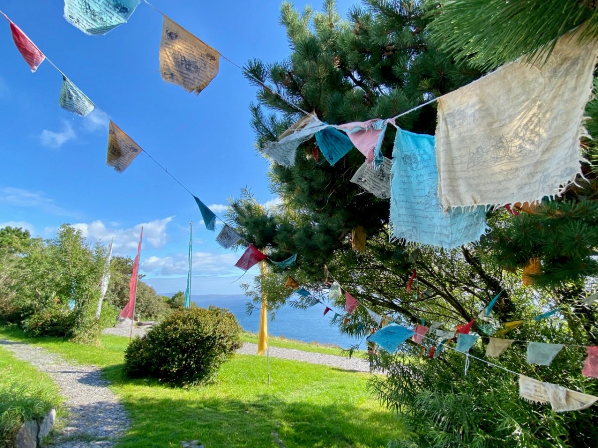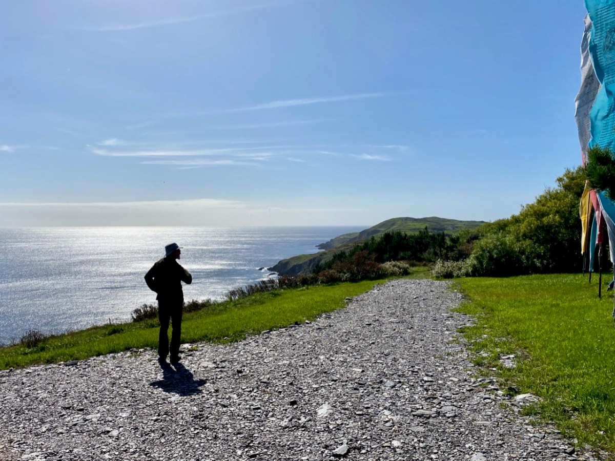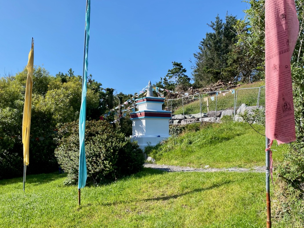 The Centre grounds already display a traditional ‘Stupa’. Originally, stupas stared out as sacred mounds or domes which were used to house the relics of the Buddha. Now they are symbolic structures which give special significance to their location, as here. They are always decorated with colourful prayer flags which serve to bless the surroundings. I can’t help seeing these flags in the same light as ‘rag trees’ often found by holy wells in Ireland. The processional way to the stupa is lined with tall prayer banners. And the whole stupa site also enjoys the wonderful views to the ocean.
