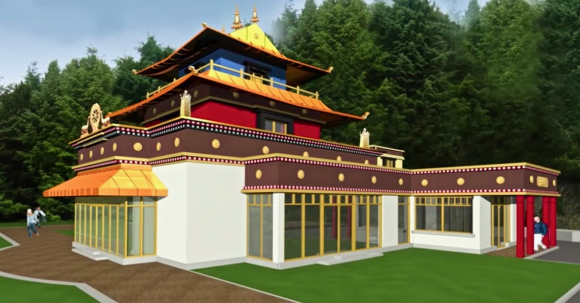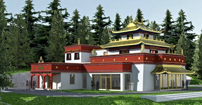 The site of the temple was consecrated in 2010 with a sacred fire ceremony. I was intrigued to read that the curving overhanging roofs are to be constructed from ‘Nordic Royal Copper’, a specially developed alloy containing zinc and aluminium: this should ensure that the copper retains its shining colour through all weathers: a traditional copper roof would become dulled and turn green after a few years. Instead, the roofs of this temple will shine like the ‘Beacon of Wisdom and Compassion’ that the architect imagined. At present, the building works are still very much in their unadorned basic form, but moving forward (below).