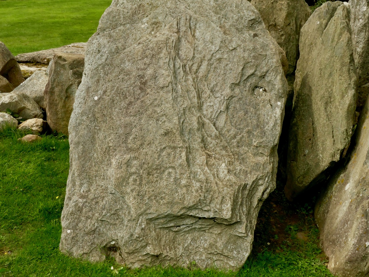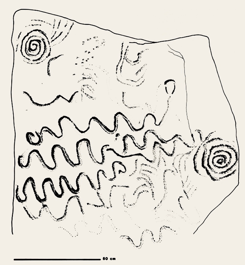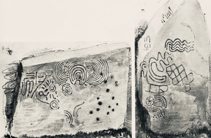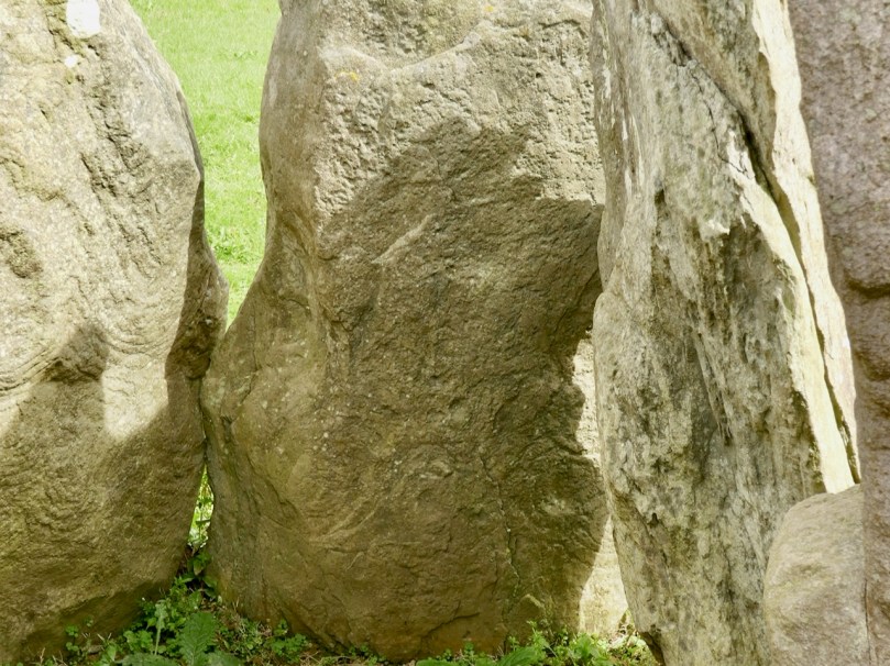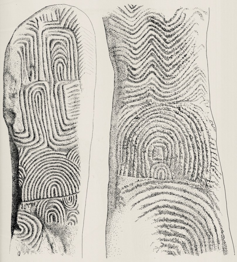 This example is very unusual in the corpus of passage grave art in Ireland. But it bears a resemblance to examples on the island of Gavrinis, in the Gulf of Morbihan, on the southern coast of Brittany, France. This has been noted by several commentators, including Muiris O’Sullivan, and the suggestion has been made that the tomb builders at Knockroe could have been directly influenced by the Gavrinis examples (which are generally thought to be earlier than the Irish parallels). It has even been suggested that passage tomb builders travelled from one site to another (like the medieval cathedral builders), and that this comparison demonstrates this. Have a look at these images from Gavrinis and see what you think (the first is courtesy of Martin Brennan, taken from his The Stars and The Stones, Ancient Art and Astronomy in Ireland, Thames and Hudson 1983):