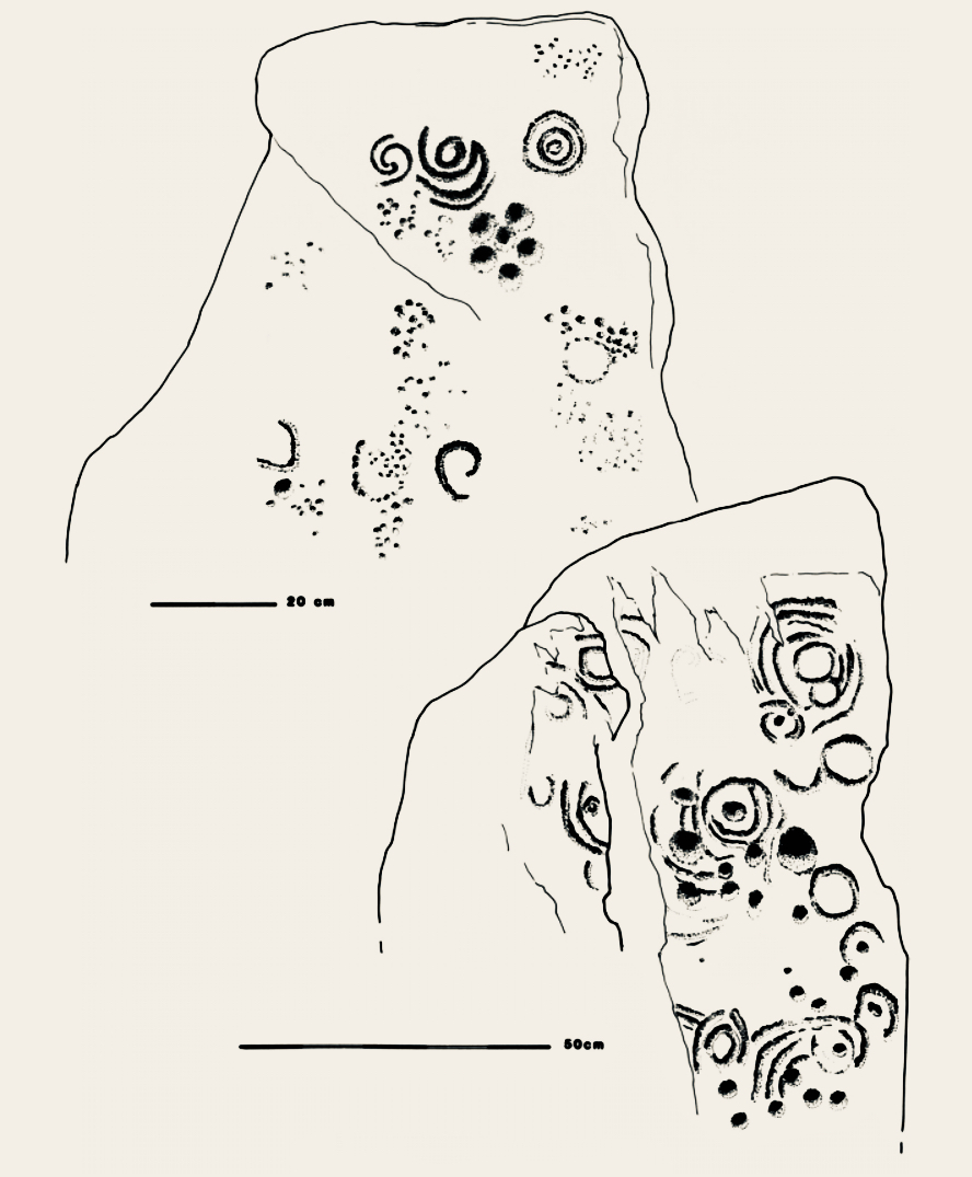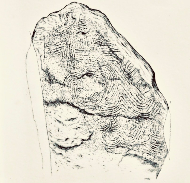 Muiris O’Sullivan penned a comprehensive article in The Journal of the Royal Society of Antiquaries of Ireland Vol 117, 1987 – The Art of the Passage Tomb at Knockroe, County Kilkenny. This is well illustrated with drawings by Ursula Mattenberger based on rubbings taken directly from the stones. Here is her impression of Stone 8 (numbering from the excavation report), which is directly facing us in the photograph above:
