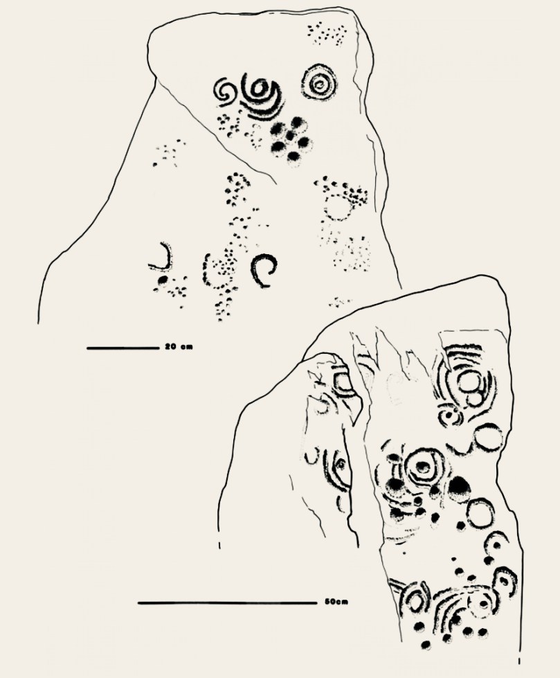 The excavation of Knockroe involved the removal of earth and debris from the collapsed mound which would have covered the tomb originally. This clearance revealed more of the art and here is an interesting comparison which shows the evolving history of the site. Firstly, our recent photograph of Stone 12, followed by the excavation record of this stone (lower right of the drawing) from the 1980s: