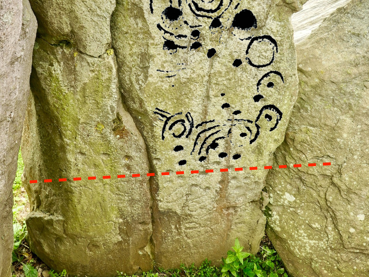 Here is our photograph again, with some of the art from the drawing above superimposed. It’s clear that the full extent of the artwork on Stone 12 was not visible below the red line when the drawing was made: Muiris O’Sullivan notes in his reports that he was aware that some of the art was hidden below what was then ground level.