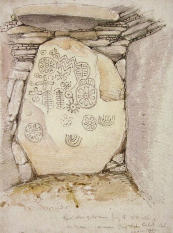 The Boyne Valley monuments are famous for their megalithic art – inscribed stones which are integral to the structures, carved some 5,000 years ago. The drawing above shows the carved stones in the great passage which we now know is aligned to the sunrise at the winter solstice. Although quite crudely depicted, these are the earliest representational images we have of passage tomb art in Ireland. A century and a half later the surveyor and antiquarian George Victor du Noyer worked with the newly established Geological Survey of Ireland and became fascinated with the megalithic art of the Loughcrew Passage Tombs in Co Meath. His recording of this, using watercolour sketches, is remarkably accurate: