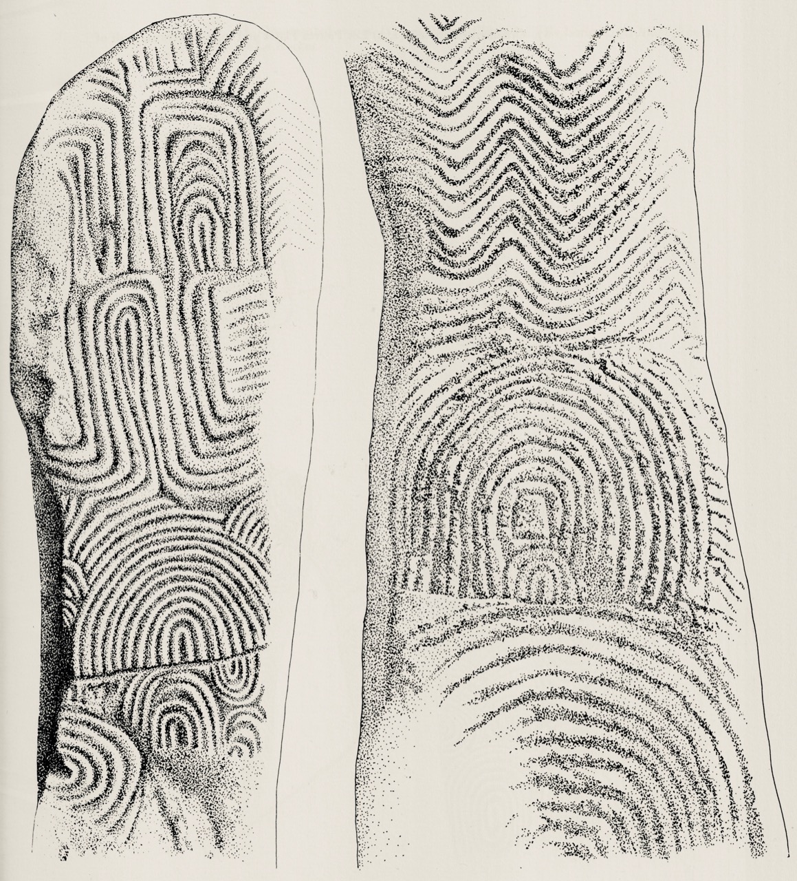 Another century on, and archaeology – and the recording of ‘ancient’ art – had increased in sophistication. Finola’s work in the 1970s used a combination of direct tracing and photography, and her opus is still one of the most comprehensive and striking collections of images of Prehistoric Rock Art. These differ from Passage Grave Art both in the motifs and the overall design of panels, but are thought to be of comparable age. Here is one of her images, of rock art at Rathruane More in West Cork: