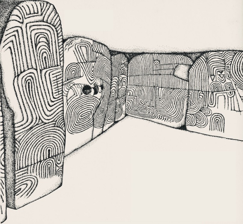 While making comparisons with rock art (and remembering that passage grave art and rock art are distinctive categories), here’s another decorated slab at Knockroe, not entirely legible in its weathered state. It seems to show a number of incomplete cup-and-ring motifs but in its own right this is known as a horseshoe motif. Below it is another of Finola’s drawings from 1973, perhaps showing something similar at Coomasaharn, Co Kerry: