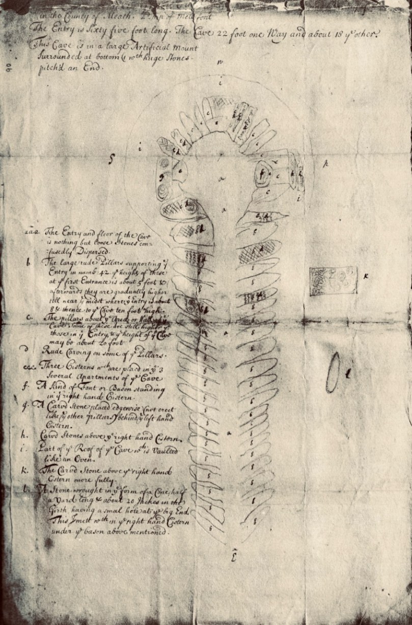 The great passage tombs of the Boyne Valley complex in Co Meath – Newgrange, Knowth and Dowth – have been known and celebrated (although not necessarily understood) by antiquarians over many centuries. Here’s an early survey plan of Newgrange drawn by Thomas Molyneux of Dublin in 1700: