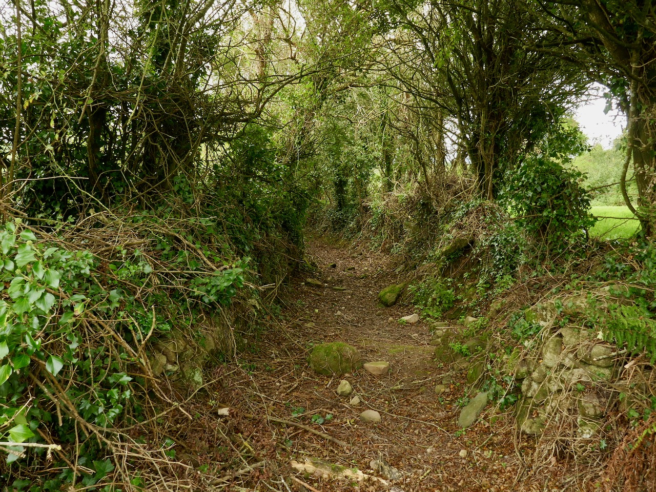 The aerial view might help to orientate you, while the 25″ OS map extract (above) dates from the late 1800s and shows the extent of the nearby Victoria Slate Quarry workings then. Slate was evidently taken from this site as early as the 14th century. In the aerial view it is possible to make out a distinct trackway which passes over the centre of the now identified passage tomb. This is clear to see on the site, and at either end the track continues, and is defined by ancient-seeming hedgebanks and established trees :