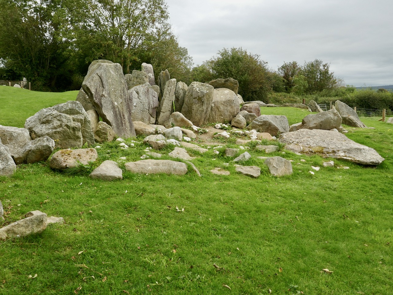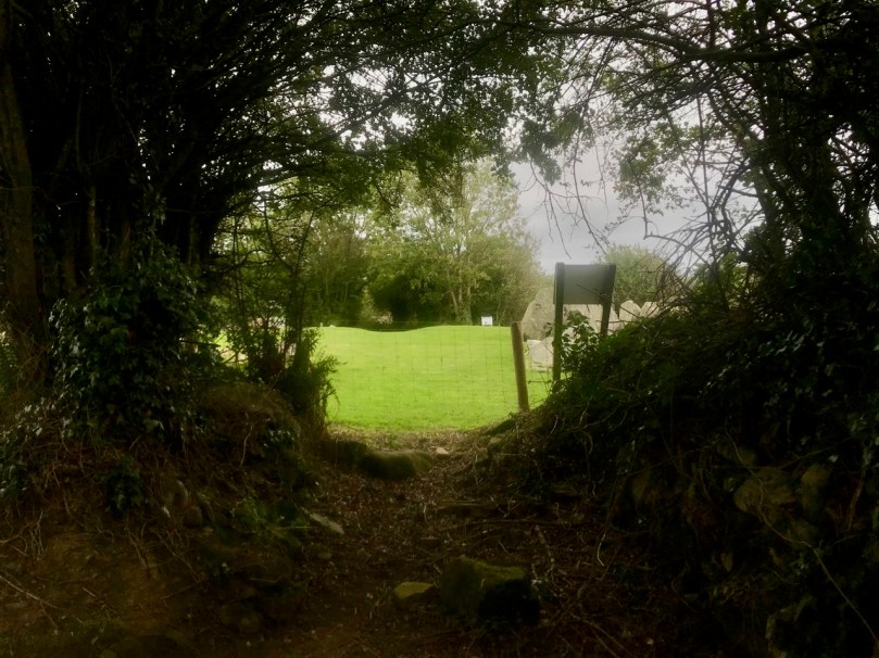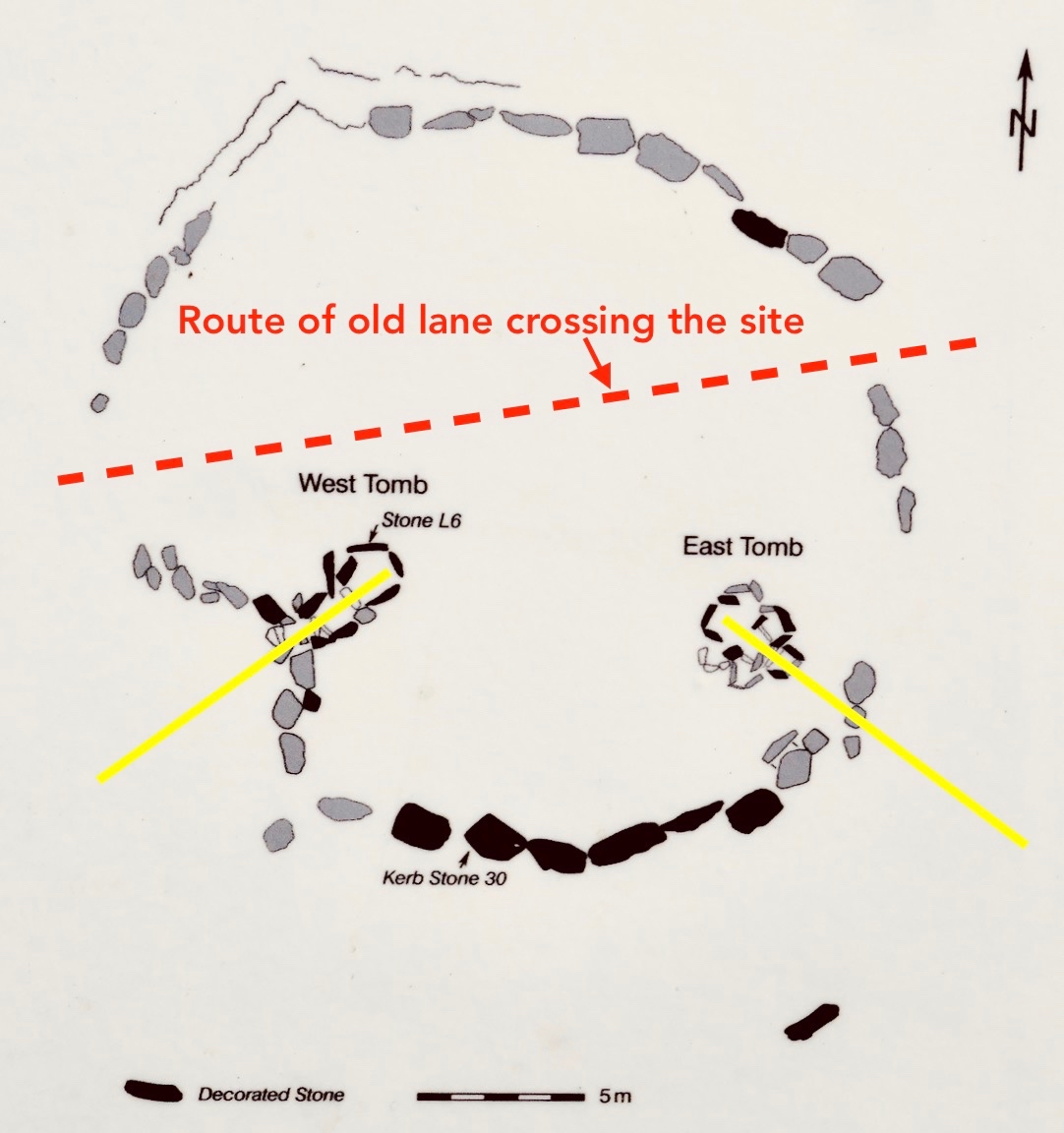 Tradition has it that the trackway was provided in the nineteenth century by the owners of the nearby Victoria Quarry to allow cattle to access the river when the quarry workings encroached on previous routes. A plan of the passage tomb is shown on the site notice board, and I have marked on it the laneway. This clearly shows the layout of the Neolithic monument, which would have been covered with an artificial mound, enclosing the two chambers. As with the larger monuments in the Boyne Valley – Newgrange, Knowth and Dowth – stones in the passage chambers and some of the kerbs are decorated, and the chambers themselves have solar alignments, reportedly with sunrise (east) and sunset (west) on the winter solstice.