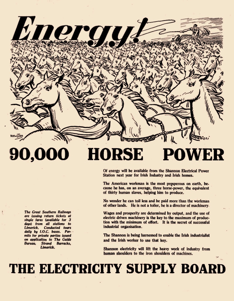 . . . 90,000 Horse Power of energy will be available from the Shannon Electrical Power Station next year for Irish Industry and Irish homes . . . The American workman is the most prosperous on earth, because he has, on average, three horse-power, the equivalent of thirty human slaves, helping him to produce. No wonder he can toil less and be paid more than the workman of other lands. He is not a toiler, he is a director of machinery . . .