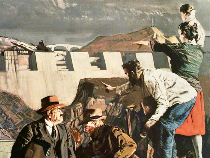 . . . Keating went down to Ardnacrusha because he knew that the construction project was emerging history. It was all happening around where he was born and raised. The machinery was going to carve up this landscape that he saw as ‘a medieval dungheap’, that was how he described it in later years. And this was a metaphor for him, the whole thing was all about Ireland moving forward into modernity. Night’s Candles features the dam at Ardnacrusha, but also includes a group of figures in the foreground, all of whom represent different aspects of what Keating saw as the Ireland of the day. When he showed it at the Royal Hibernian Academy in Dublin, it was called ‘the problem painting of the year,’ which Keating thought was hilarious. They couldn’t get their heads around this idea of what he was trying to do at all . . .