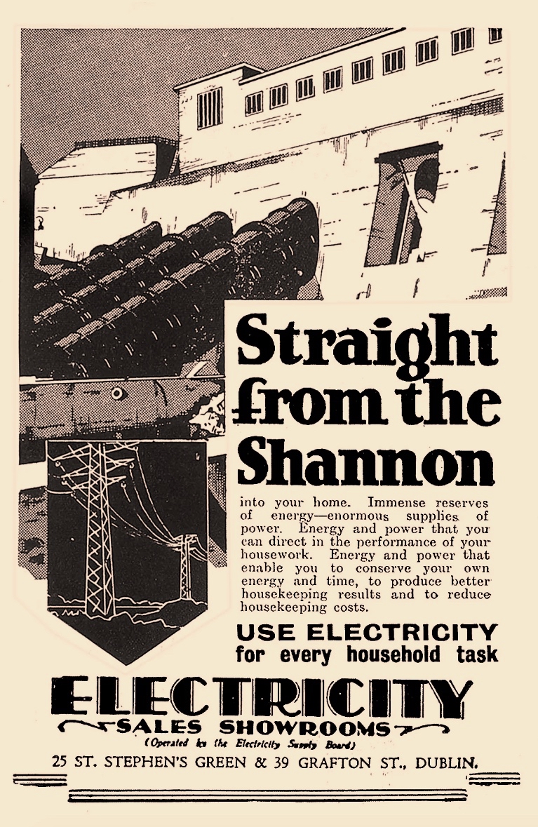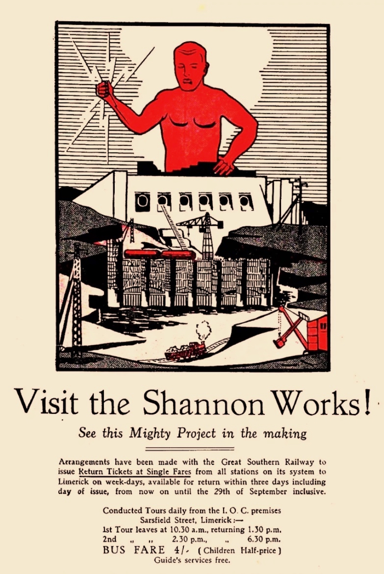 There’s a wealth of tales to be told about the first decades of independent Ireland. The 1920s and 1930s saw a flourishing of confident projects portraying a nation on the cusp of change, establishing itself in Europe and beyond. One such was the hydro-electric scheme at Ardnacrusha on the River Shannon. Foundations were laid in 1925 and works completed within four years, providing the young country with what was then the world’s largest power station. The intention was to enable everyone in Ireland to avail of the most trendsetting modern commodity: electricity.