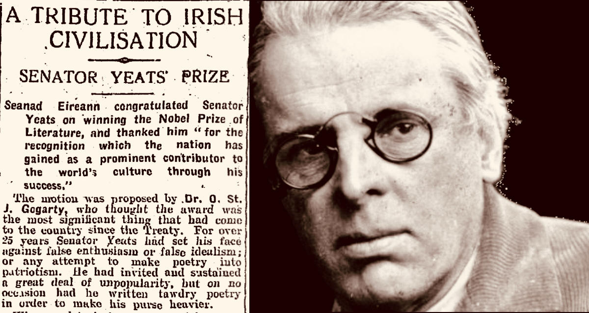 Somewhat surprised by the award, Yeats would later write in his (unpublished) autobiography: “Early in November (1923) a journalist called to show me a printed paragraph saying that the Nobel Prize would probably be conferred upon Herr Mann, the distinguished novelist, or upon myself, I did not know that the Swedish Academy had ever heard my name.” The news of the award was widely praised in Ireland with members of Dáil Éireann proudly announcing that it had placed Ireland on the international stage. It was a sentiment reiterated by the laureate himself, who at the awards ceremony claimed that the Nobel Prize was less for himself than for his country and called it Europe’s welcome to the Free State. In his presentation speech, Per Hallstrom, then chairman of the academy’s Nobel Committee, praised the poet’s ability to ‘follow the spirit that early appointed him the interpreter of his country, a country that had long waited for someone to bestow on it a voice’.
