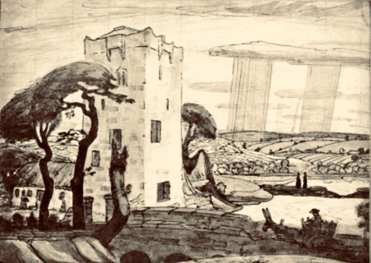 Here is the finely crafted cover of The Tower: a book of poems by W B Yeats, published in 1928 (courtesy Yeats Thoor Ballylee Society). The Tower was Yeats’s first major collection as Nobel Laureate after receiving the Nobel Prize in 1923. It is considered to be one of the poet’s most influential volumes and was well received by the public. (Below) a 1917 drawing by Robert Gregory – son of Isabella Augusta (Lady) Gregory and Sir William Gregory of Coole Park, Co Galway – of The Tower (courtesy Yeats Thoor Ballylee Society).