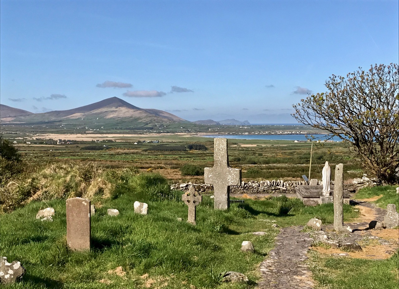 We traversed the Dingle Peninsula on the way to our week-long ‘Irish Immersion’ course. Our route included the Conor Pass (above) – possibly Ireland’s highest mountain pass with a summit of 456m: not to be missed, as the views from it are spectacular in all directions. Do be careful, though, as it’s included in the list of ‘the World’s most dangerous roads’. That’s because in places it is only a winding single track, with the way almost tunnelled out of steep rock faces: don’t try it in a bus!