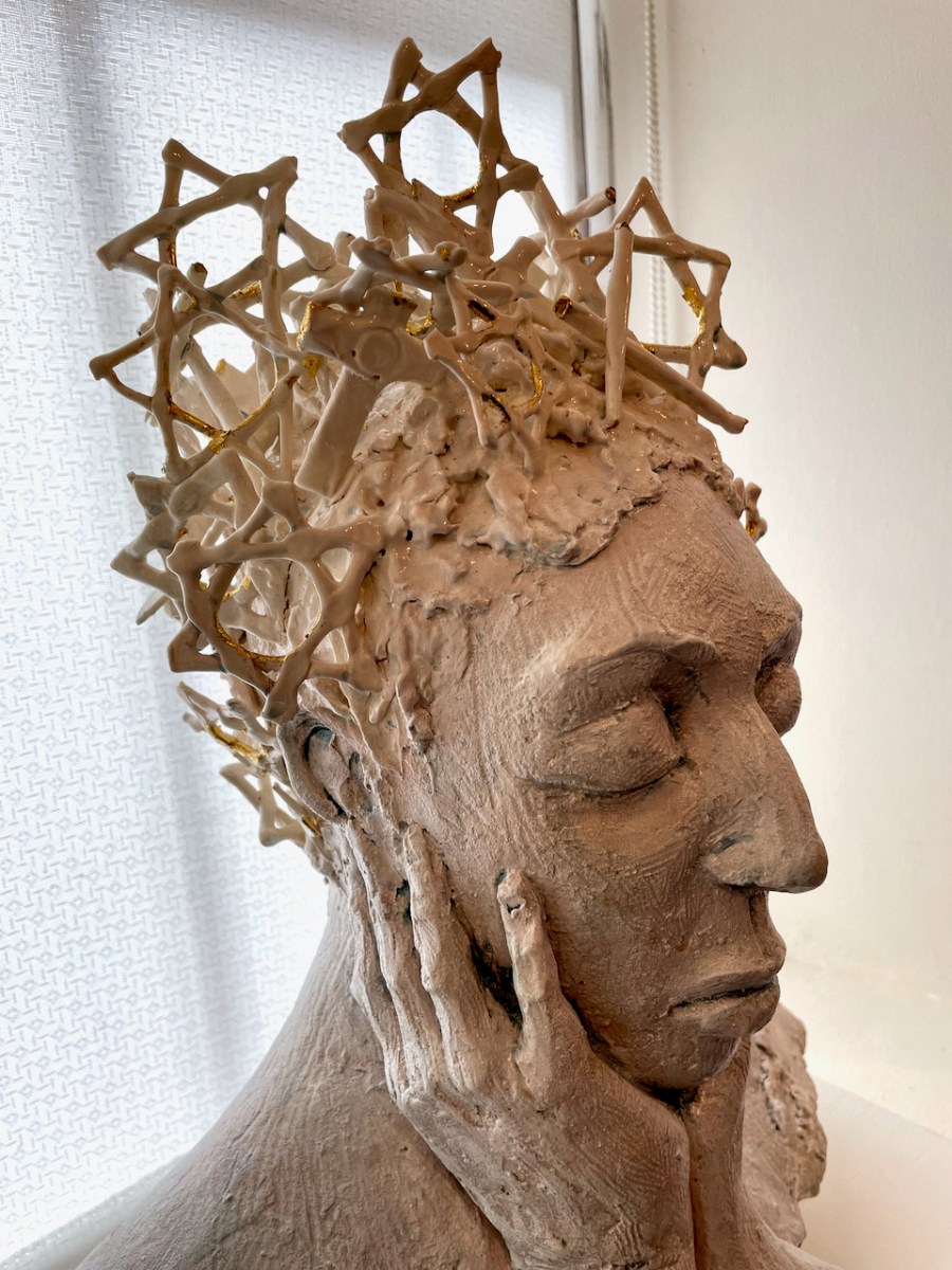 While out exploring the byways of rural County Wicklow, we chanced upon le Brocquy’s burial place. It’s in the little Church of Ireland graveyard at Calary. We had never heard of it before but – as we reconnoitred – the realisation dawned upon us that this is a very special site. Le Brocquy is probably the most eminent artist interred in these grounds, but he is only one of very many who have presumably chosen to spend eternity in this remote but extremely beautiful corner of rural Ireland. The views towards the not-too-far-away mountains are dramatic.