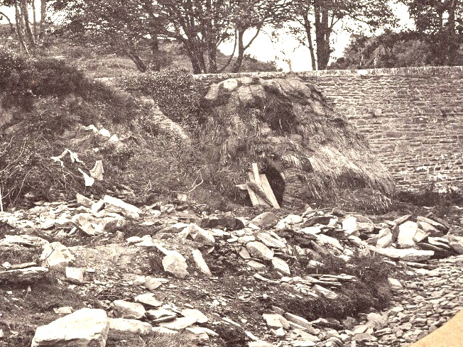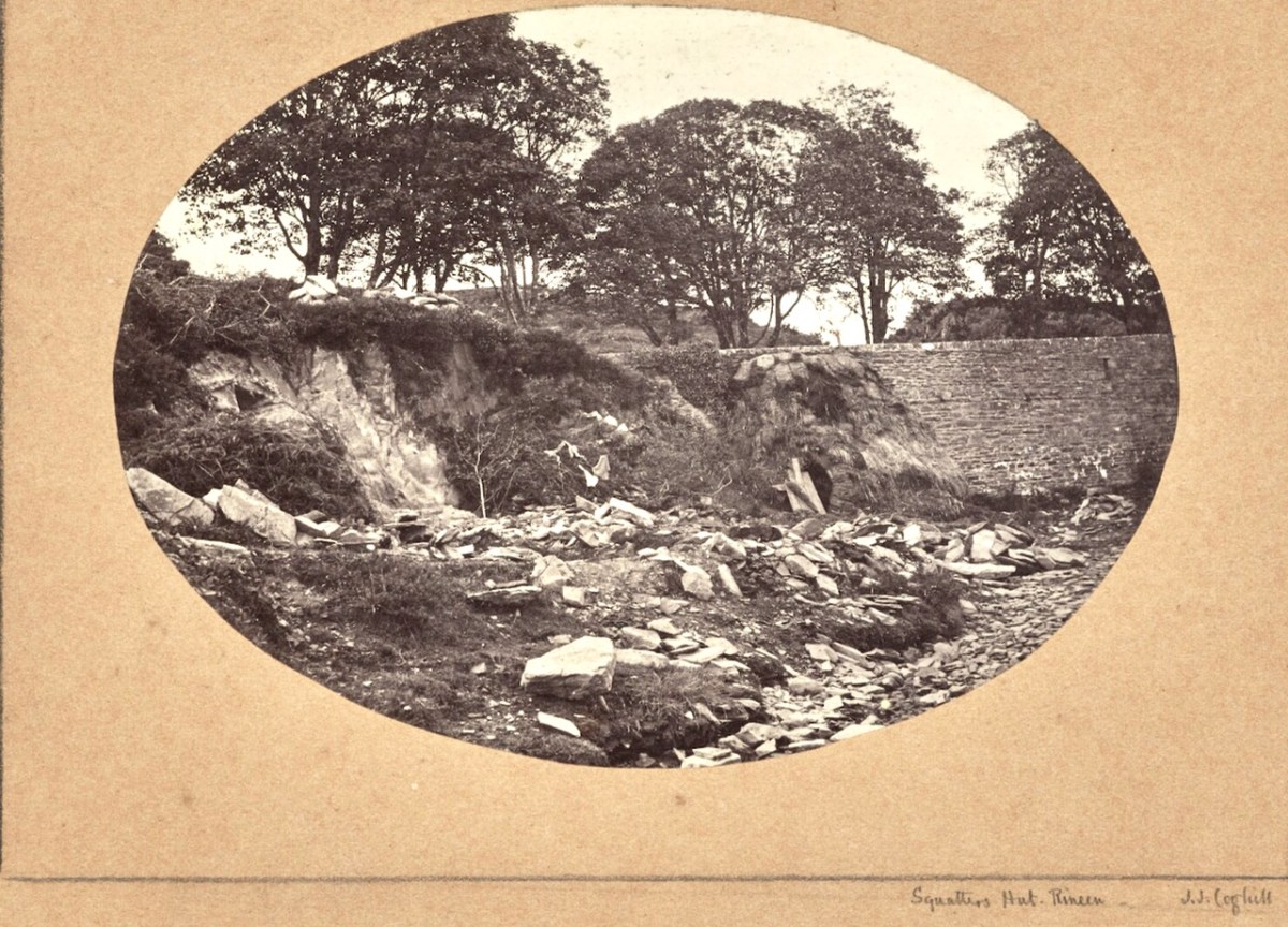 For example, the photo above, detail below, is of a “Squatter’s Hut, in Rineen (the same bridge I featured last week). It’s a fascinating and important image, as it is the only photograph I have ever seen of one of the miserable cabins (known as fourth-class housing), made of sod, in which many of the poorest people lived in West Cork before the Famine.