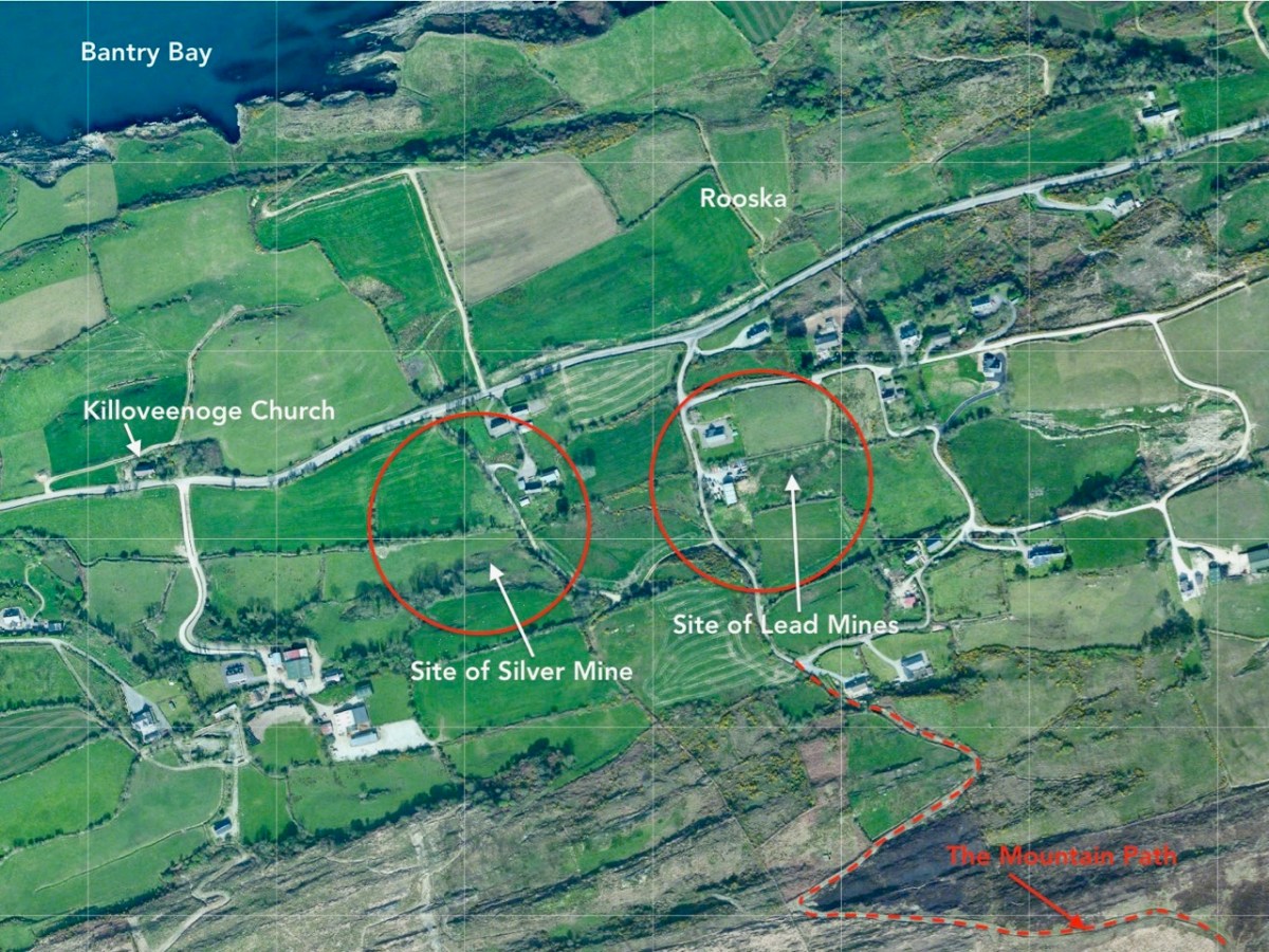 This view over the Northside area of Rooska, above, shows several features and the beginning of the path over the mountain heading south. Notable is Killoveenoge Church, known as a ‘Chapel of Ease’ and said to have been built in the 1860s specifically for the English and Cornish miners who were working in the nearby silver and lead mines at the time. There are scant remains of these mines now, and the Church of Ireland building was closed in 1988 and converted to a studio.
