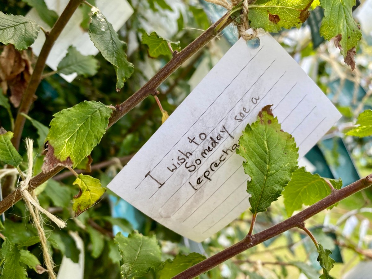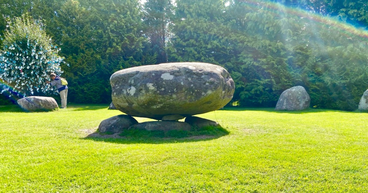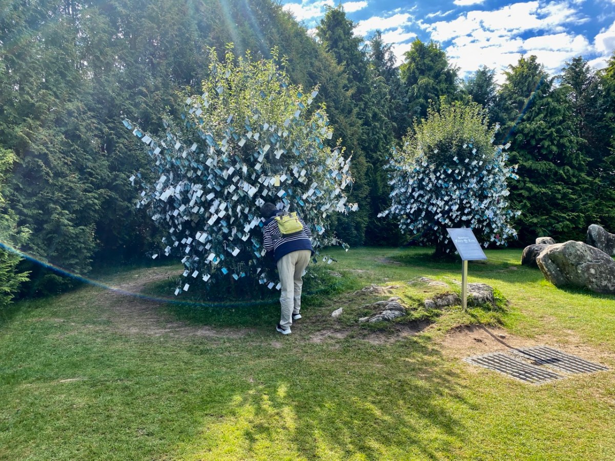 It’s impossible to ignore the two ‘fairy’ hawthorn trees that have been established within the vicinity of the stones. In my opinion it was an inspiration to exploit the idea of visitors purchasing ‘message cards’ from the site kiosk and writing down their own thoughts and personal wishes, which are then tied on to the branches. That’s Finola, above, being affected by the rainbow fairy vibes. She has written her own post today specifically on this aspect of the place. My favourite message is this one, below: