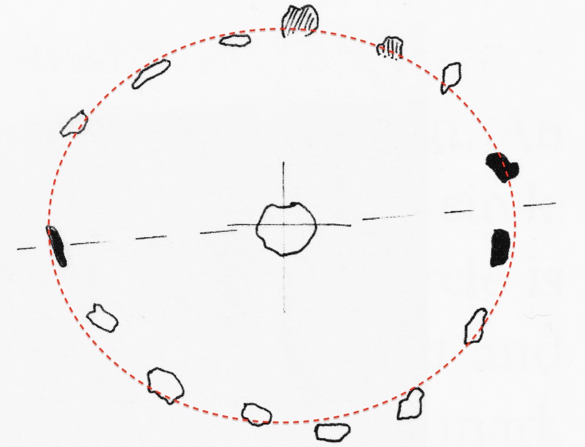 The two drawings above are from Jack Roberts. On his survey (top) I have superimposed an oval template which confirms the suggestion that the Kenmare ‘circle’ is egg-shaped. In the lower sketch view – probably dating from the 1980s – the stones appear to be out in the open, free from the present-day tree shielding.
